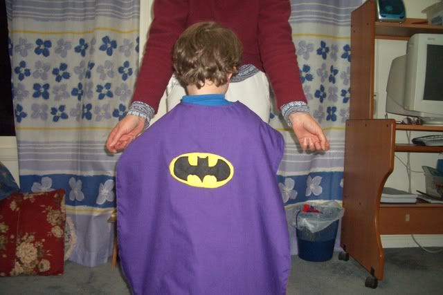 Going to the mainland on Saturday to get a refund on our lounge as it's been a no-show after 2 months. :rolleyes: Hopefully I"ll see something in another store I like for the same price. Will get the table & chairs though. Here is the cape I made DGS. Superman & Batman. They are reversable. He loves it.