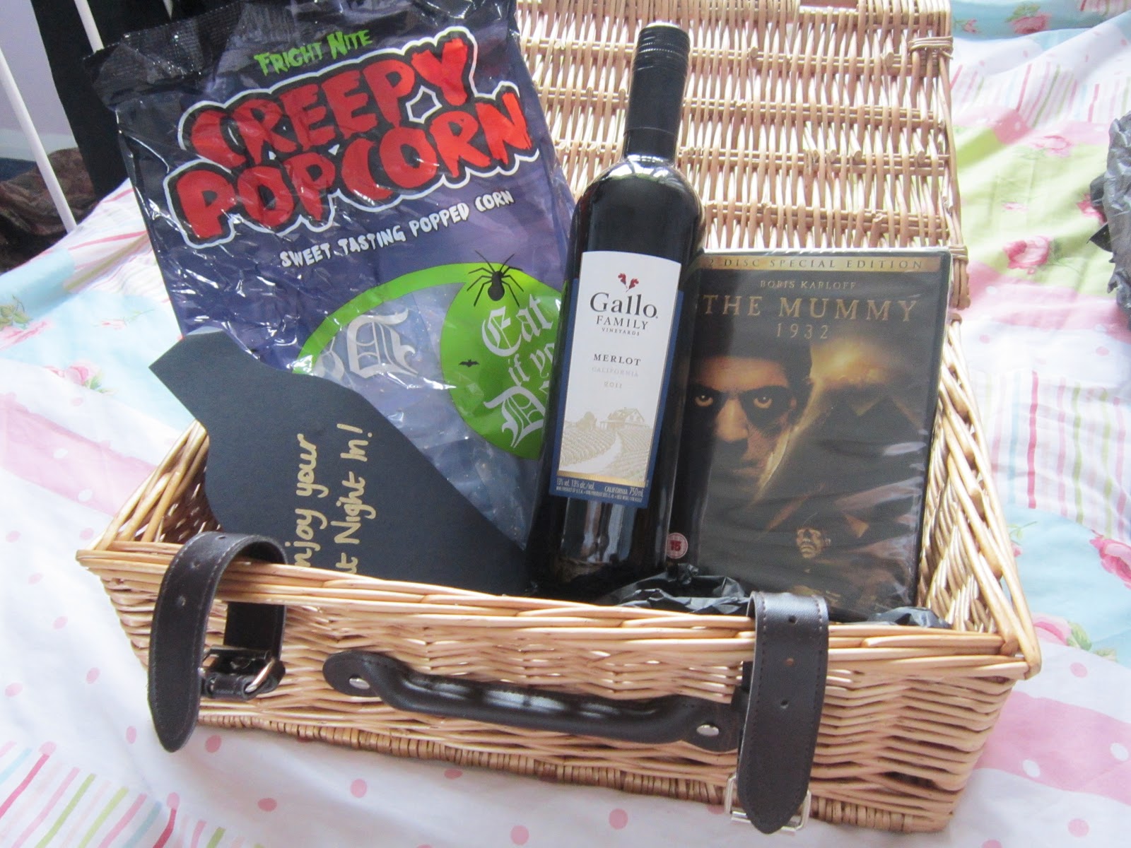 Fright Night in hamper from Tesco, which inclulded a DVD, popcorn and a bottle of wine, all in a wicker hamper. RRP £20