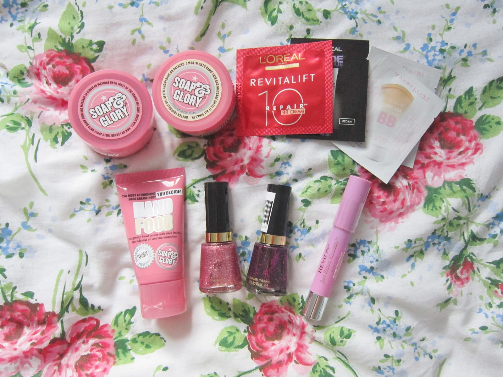 Three Soap and Glory minis, 2 Revlon glitter polishes, a Revlon Just Bitten lipstick, and some samples.