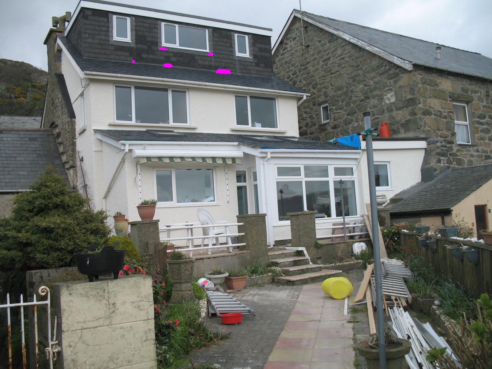 I've put a temporary photo on my blog (hope that works). Imagine you are standing inside the room, the pink is where the rain has come through. That photo wasn't taken today by the way, so the darker slates aren't the ones affected by the latest rain.