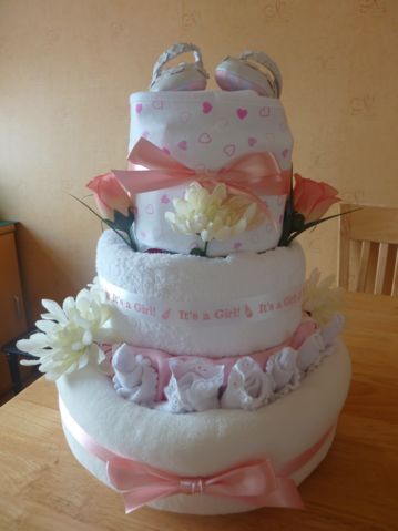 This cake contains:34 Pampers Mini Nappies3 x Early Baby Bodysuits1 x Johnsons Naturals Lotion1 x Johnsons Naturals Baby Shampoo1 x Johnsons Baby Soap1 x Baby Nail Clippers1 x Baby Feeding Set2 x Baby Hats2 x Pairs of Baby Scratch Mitts6 x Pairs of Baby Socks3 x Feeding Cloths1 x Pair of White Baby Shoes1 x Bath Towel6 x Tea-LightsFlowersRibbon Trim