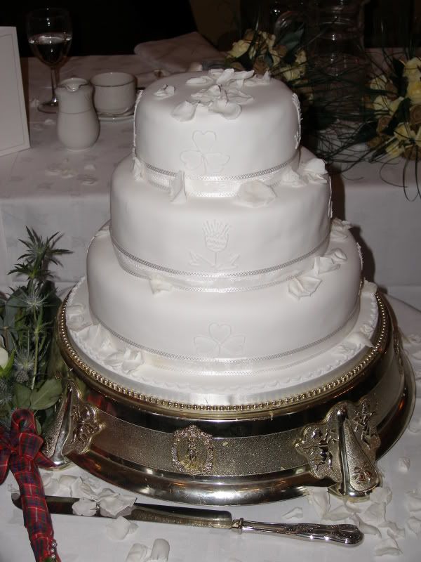As I wanted a chocolate cake and not a fruit one. However two days before the wedding it melted into itself and became a squished mess in the bottom of a cake box!!! So a quick trip to ASDA - three fruit cake tiers, some pink ribbon, gerberas and an ornament later we came up with the following: