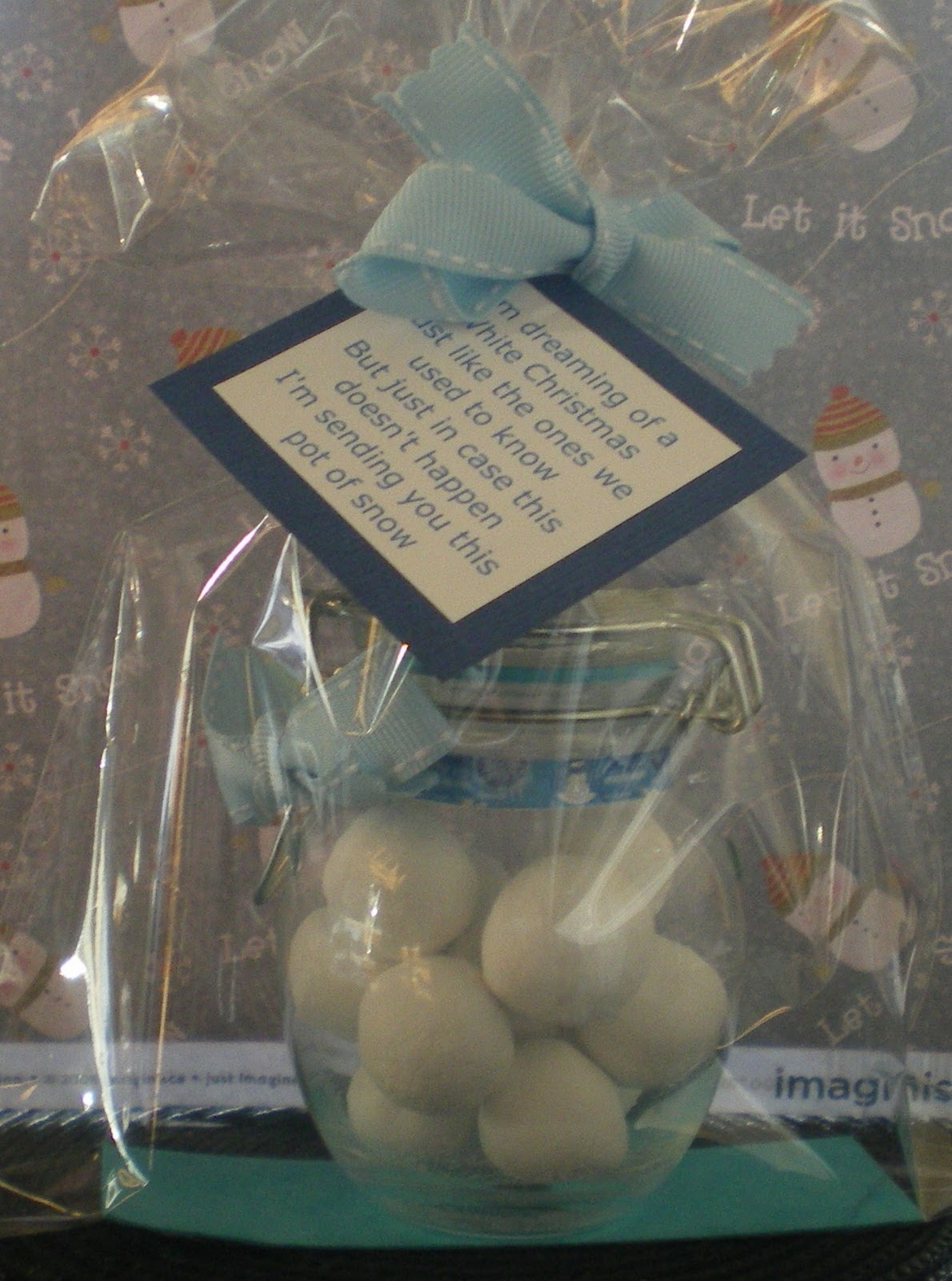 I've done jars of snowballs with snowman face on the front or they've been gravy tubs covered in snowman paper and this is the verse i did for them