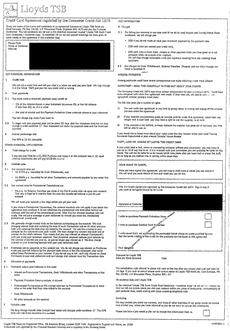 The above is a valid CCA, it is not an application form or terms and conditions, but a legal CCA that lloyds provide. Yours may differ as they change them, as does each creditor but there is certain information that must be contained on the page - http://forums.moneysavingexpert.com/showthread.html?p=26867833#post26867833Although no trees were harmed during the creation of this post, a large number of electrons were greatly inconvenienced.