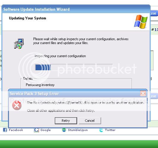 I suspect that the failed SP2 reinstall is hanging and that won't allow SP3 to install. You have posted the failed SP3 pic very soon after the failed SP2 attempt.