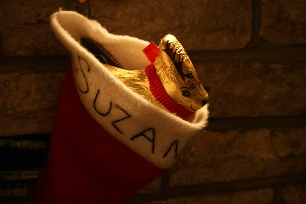 This is what our stocking's look like (this is mine.) Nana made them for us when we were kids. Just simple red with white trim but they've got our names on and a little green tree (on the other side for this photo) and they've worn spectacularly well!