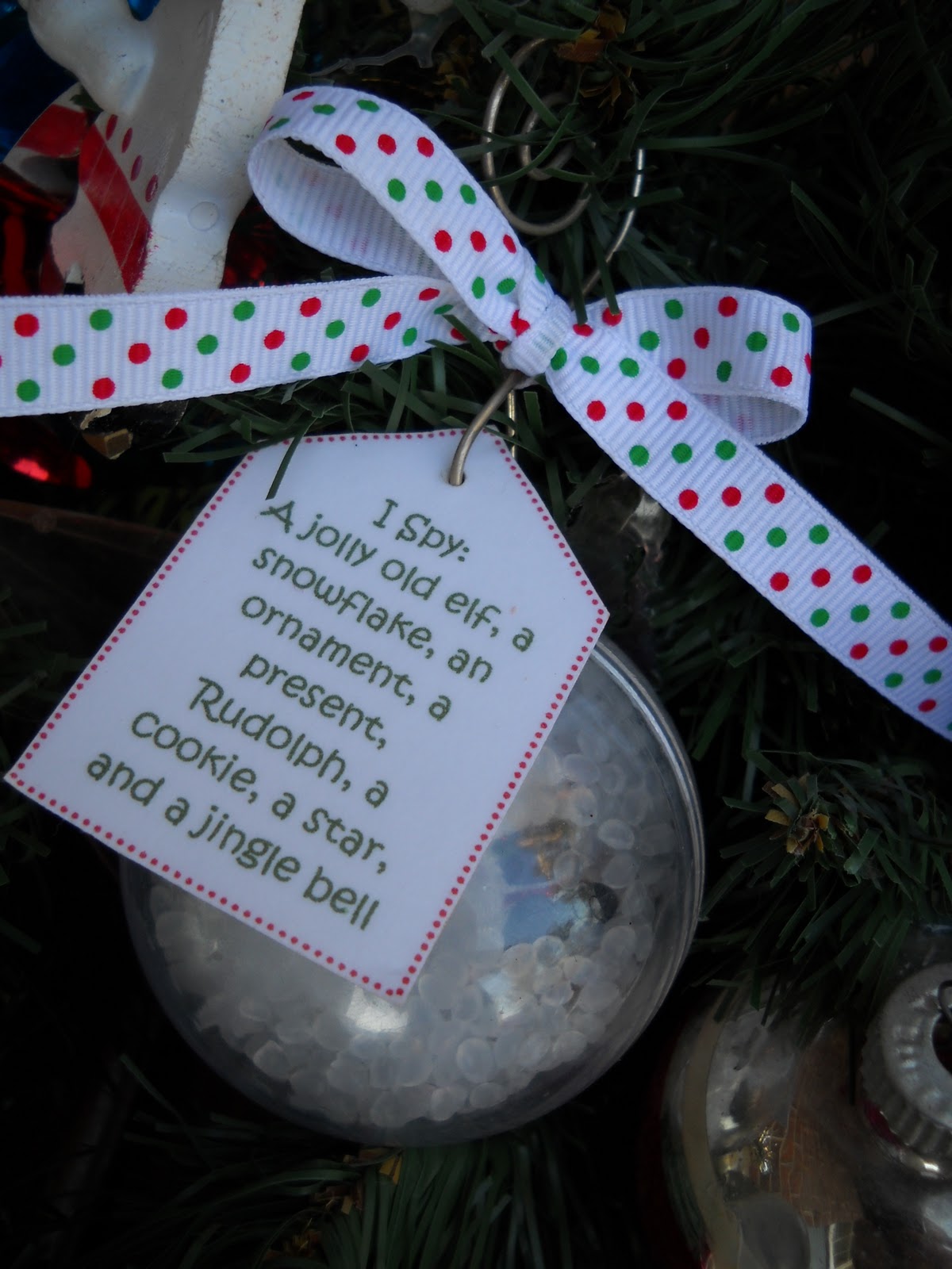 I came across this this morning and thought it was a great idea to hang on the tree or as a gift tag (although Im not sure if the baubles that split in half are very easy to find? Its an eye spy bauble!