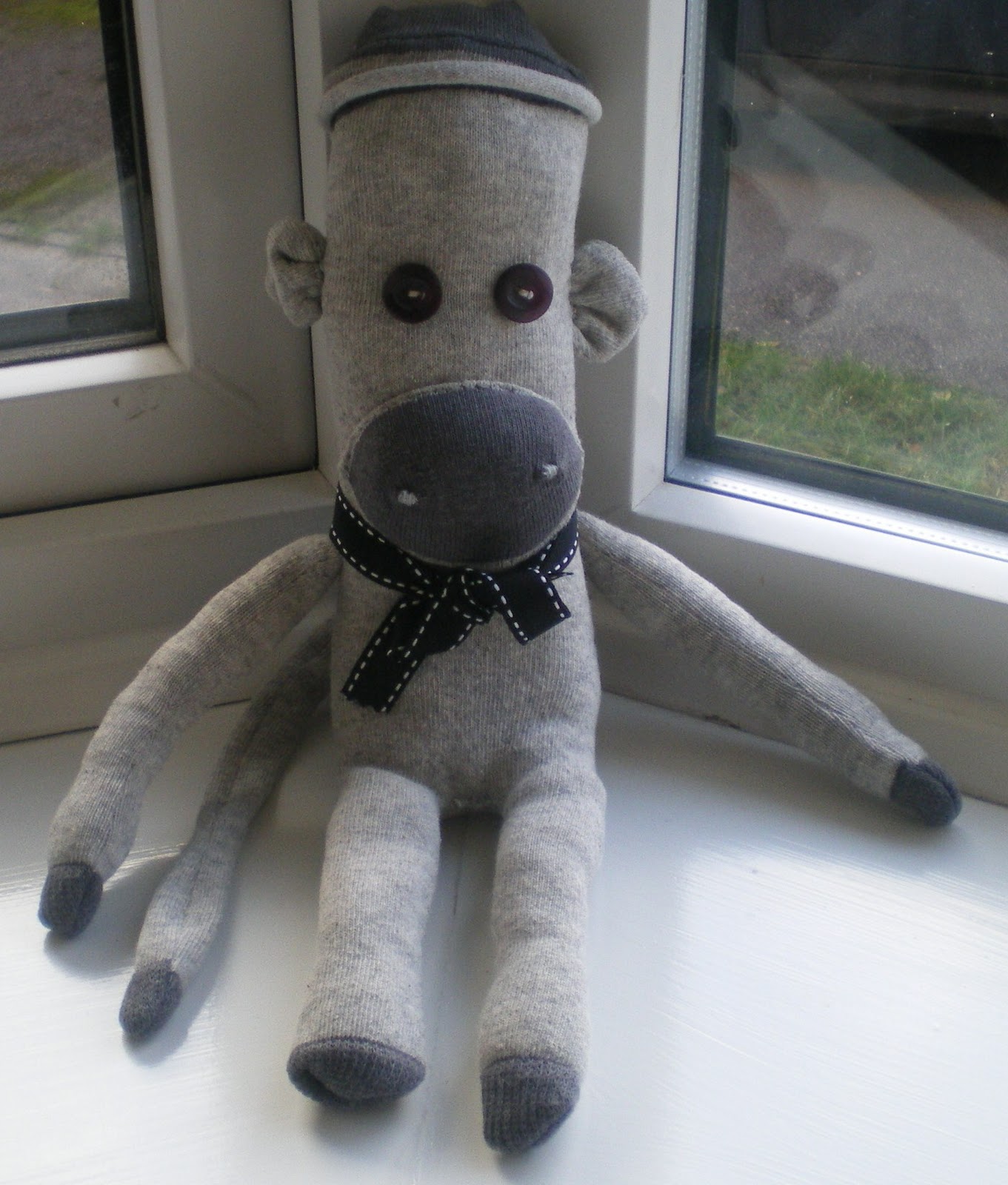 I got 50yds of really wide blue ribbon from Costco yesterday for £5. It is ideal for wrpping these kinder choc bars in.Whoever was asking about sock monkeys (sorry terrible memory:o) this is one i made recently. I use a machine to do mine but i'm sure you can make them by hand just as easily.
