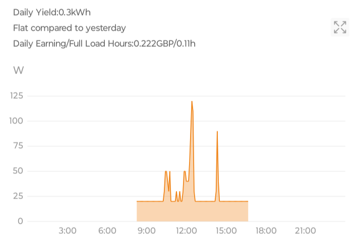 Does anyone really believe it was generating 20 watts continuously from 0815 to 1640? No, of course it wasn't. That's just the minimum increment on the data logger.If we deduct 170Wh (the 20W minimum) from the 300Wh it's recorded, we are left with 130Wh of generation. Which is about 0.048 Os.N. Hampshire, he/him. Octopus Intelligent Go elec & Tracker gas / Vodafone BB / iD mobile. Ripple Kirk Hill Coop member.Ofgem cap table, Ofgem cap explainer. Economy 7 cap explainer. Gas vs E7 vs peak elec heating costs, Best kettle!