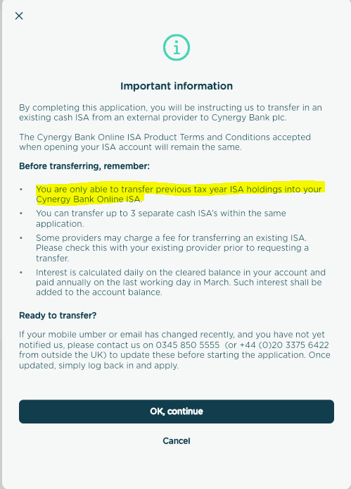 You hit apply and the below will appear with a strange message that indicates that you can only transfer in up to 3 ISA's from different suppliers and only funds from previous years.
