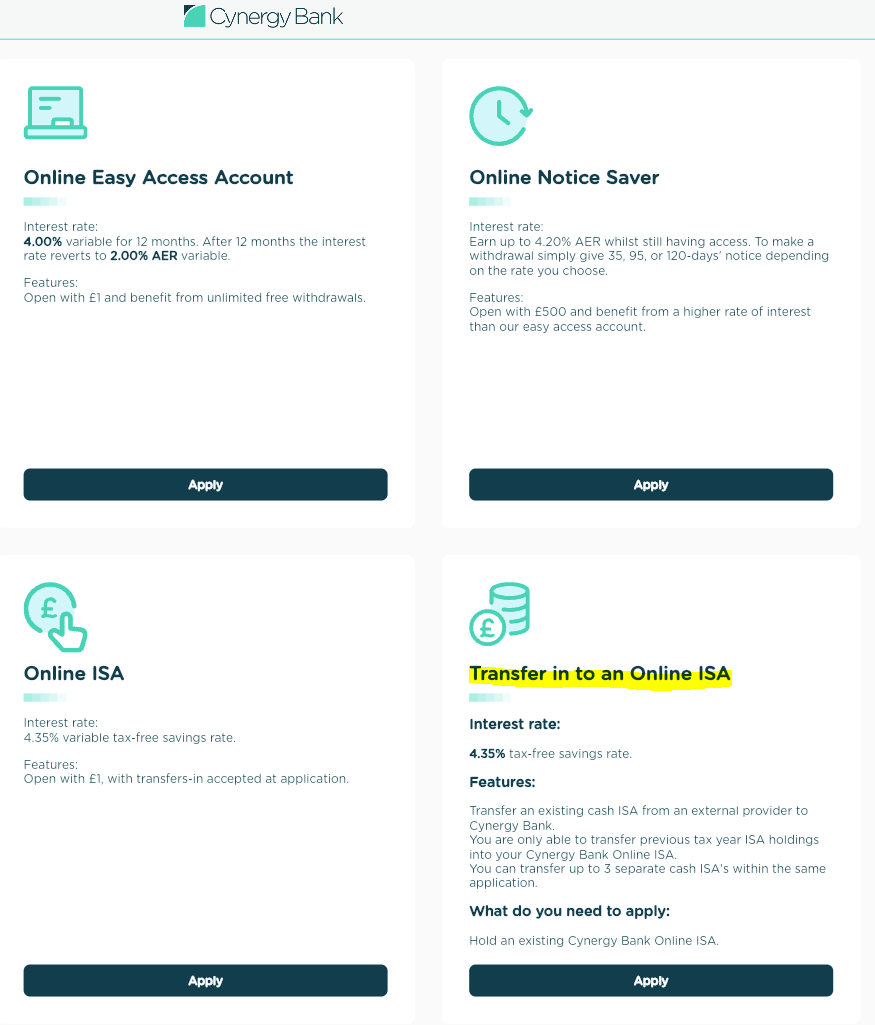 I inquired about this because my ISA with CMC is not accepted by Cynergy so I need to go via an intermediary provider, in my case Coventry BS, in order to get my funds into the 4.35% Cynergy Cash ISA.