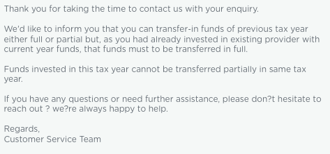 To me the message above and the message in the CS response are contradictory. So once my funds from CMC, including this years contributions have moved in full to Coventry I will initiate a full transfer from Coventry to Cynergy. Should this be declined I have reason to complain as the customer service message is pretty clear to me that they accept current year funds but only in full, which is in line ith the ISA regulations that current year funds always need to move in full and only previous years funds can be transferred partial, if the provider provides partial transfer in requests (and out outgoing provider also offers that).