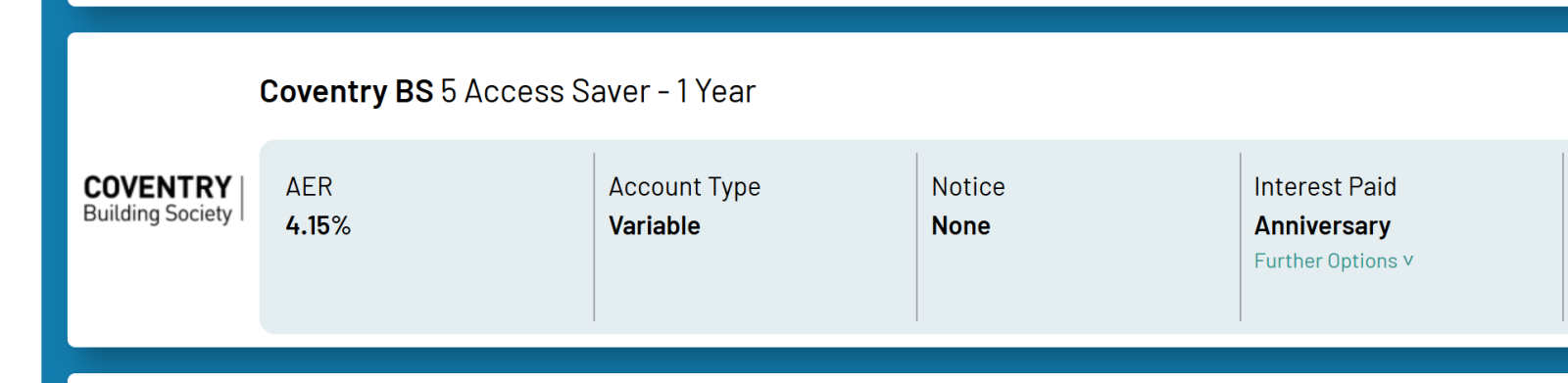 pecunianonolet said:Coventry 5 Access Saver - 1 Yearb at 4.14% to go NLA