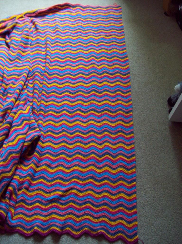 [FONT=Verdana, sans-serif]HERE'S a pic of my blanket. I can't take a pic of it laid out flat, it's too wideWhen the rain stops, I'll hang it on the line and take a photo. STARS I don't like blocking, but these need it