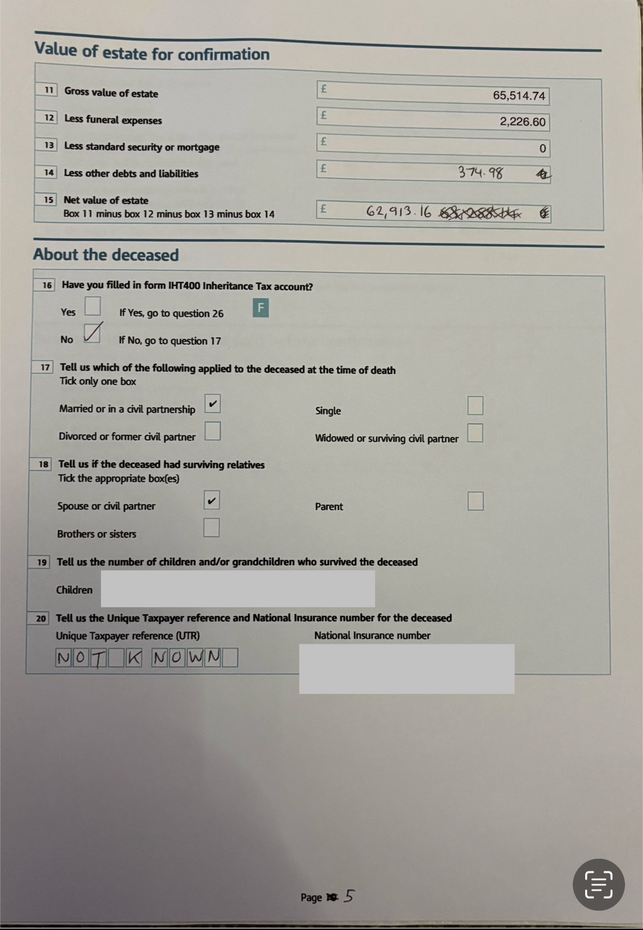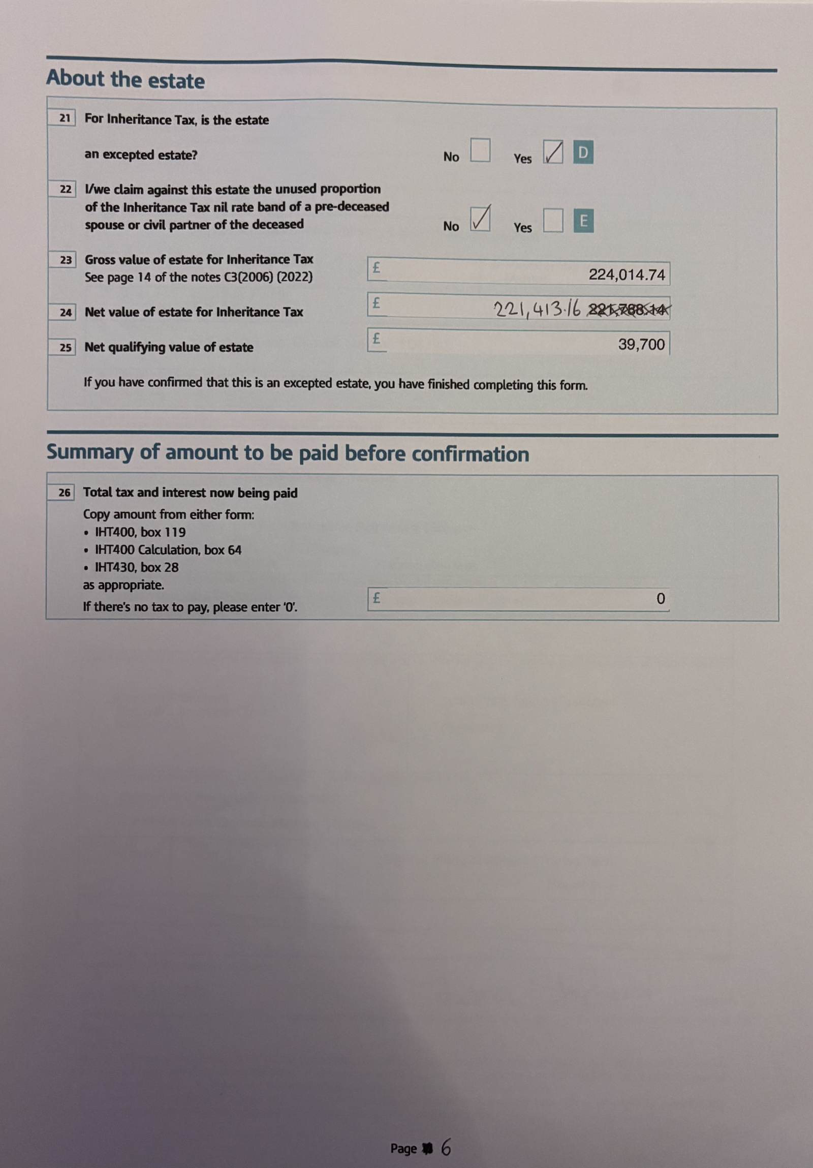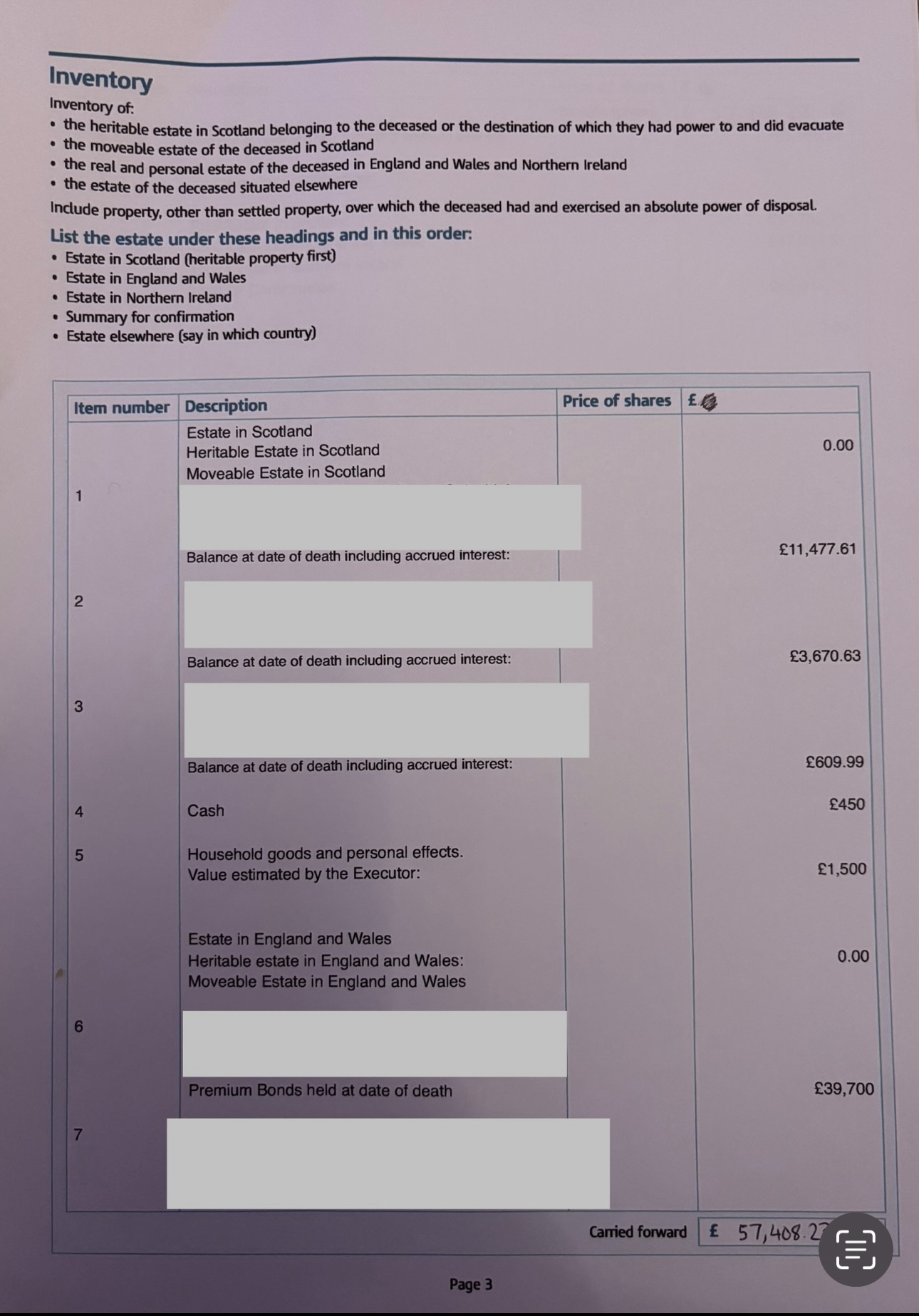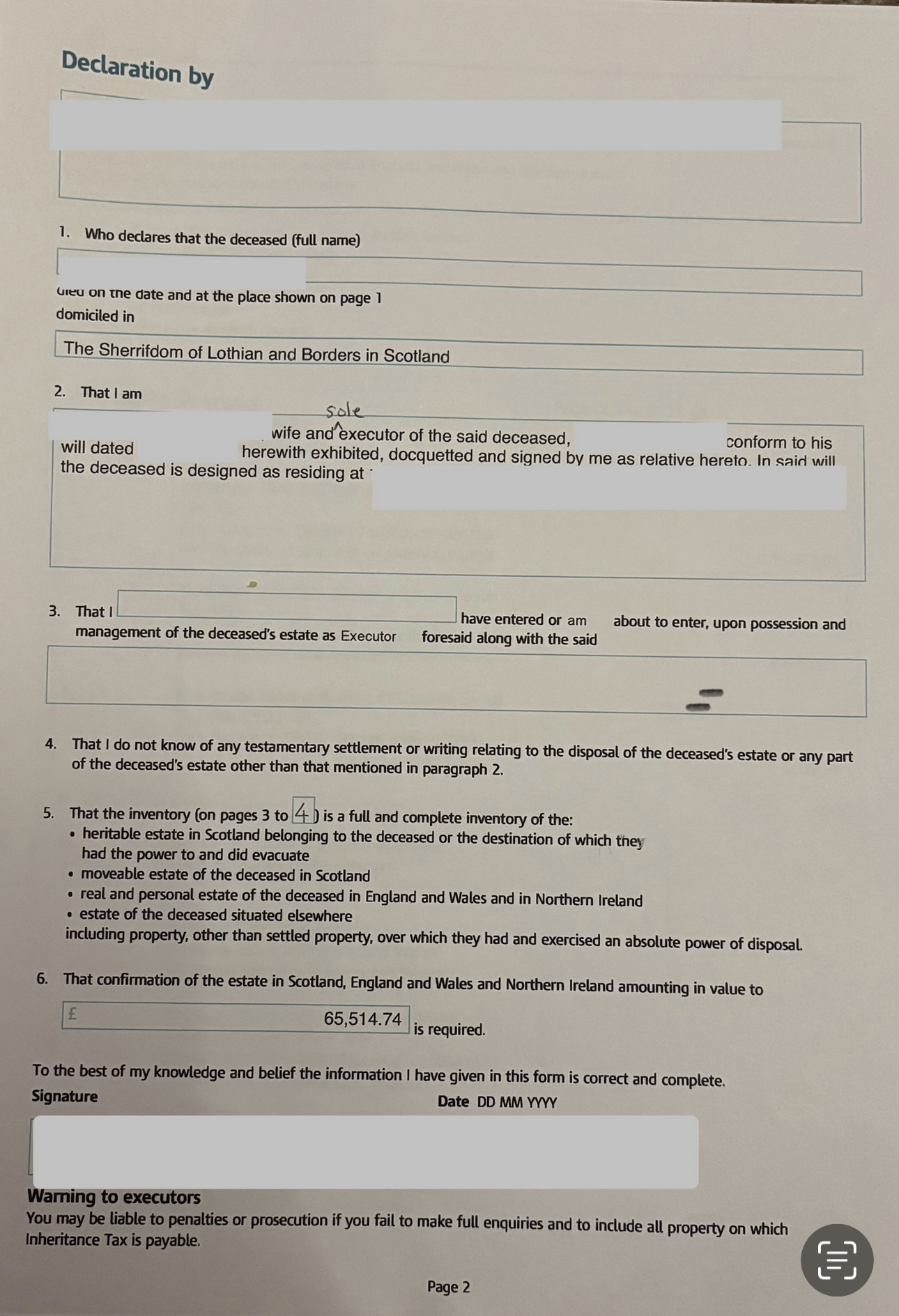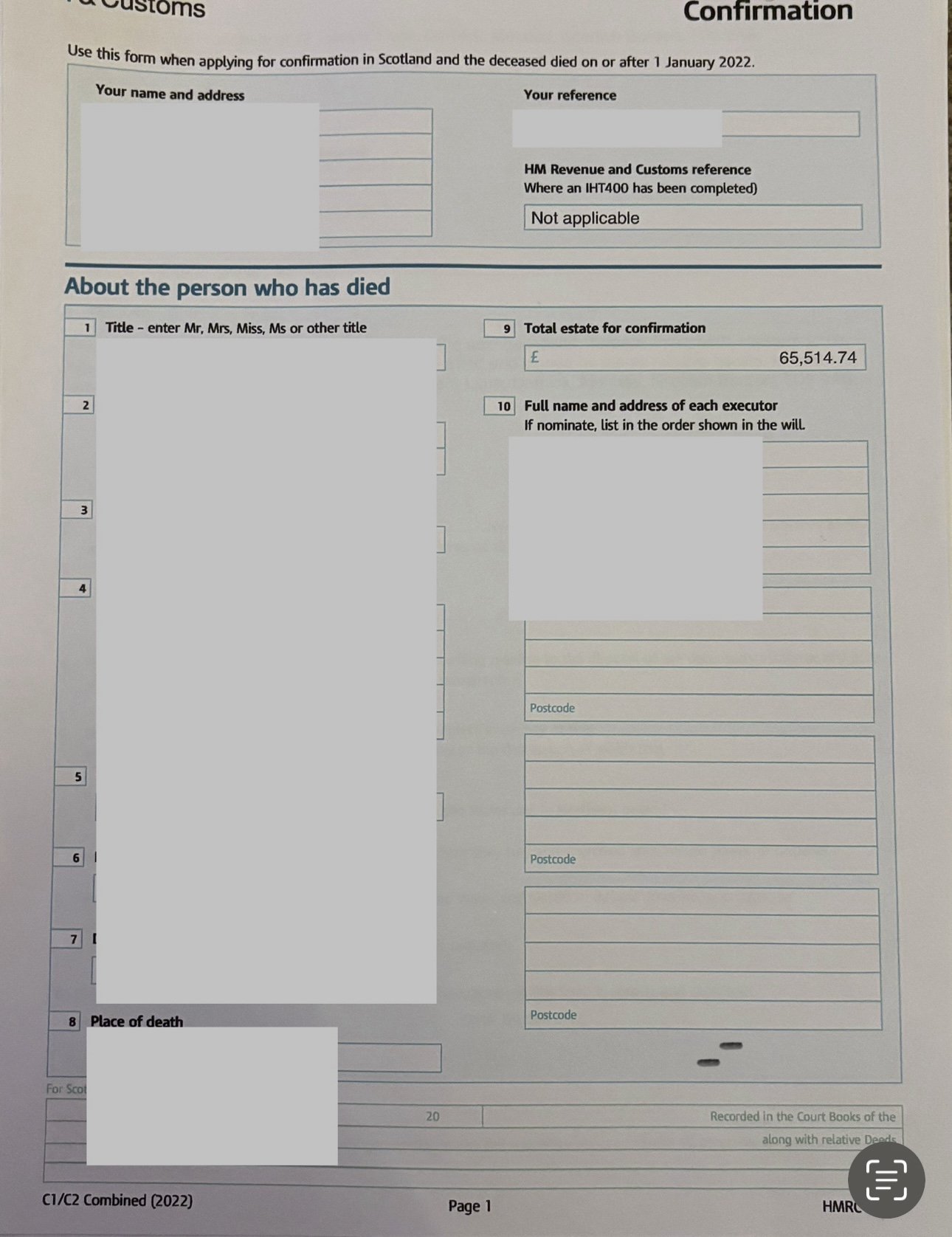 Thanks buddy9, I attach a redacted copy below, apologies for the pages not being in the correct order.In panel 8 I put the house number and town and Scotland but not the postcode.In the inventory I entered the names of banks and their addresses and a/c no and sort codes.I didn’t add the house value to the inventory as it passed to the executor under survivorship but I included half the value of the house in box 23.