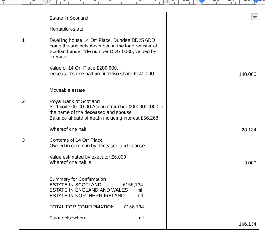 A generic inventory example is shown below but you will need to insert your own relevant specific detail and values. The example assumes that the house is registered in the land register and that there is no survivorship in the title.
