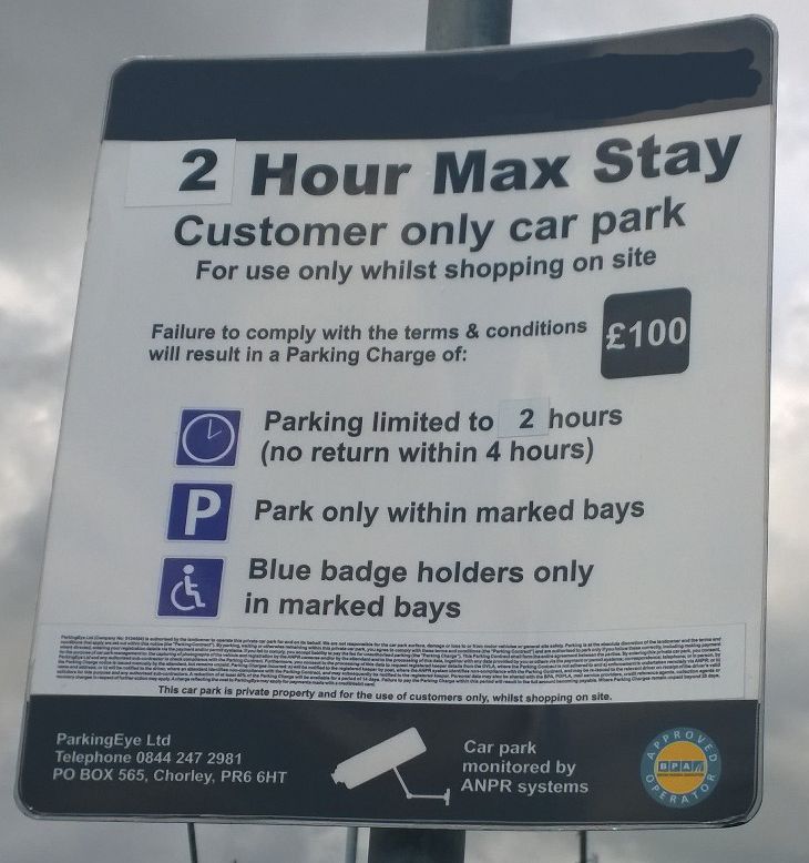 Whilst I can confidently say that point 1 definitely applies in this case (they lost out on a single space in a mainly empty car park for one hour of the shop being open), I don't know if that alone is strong enough for me to win. Point 2 may be the case but to be honest I have no idea. As for point 3, they've got several signs dotted around the car park, each one measuring roughly 1ft by 2ft, and they seem to be pretty clearly worded. Below is a link to a photo of one of these signs, with the retailer's name blacked out (at the top) just in case anyone from ParkingEye is lurking on here and I say something that could help them rob me blind.