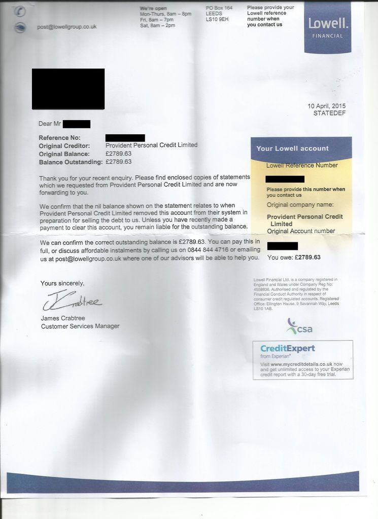 I've finally received a reply back from Lowell regarding my letter I sent off requesting proof of the outstanding debt. I have linked the scanned letter and statement they have sent me out. Any ideas where I go from here? They still haven't actually sent out anything signed or any documents showing the debt being sold to them by provident. The statement they have sent out doesn't show a breakdown of any payments made either, just the repayment terms and again doesn't show when the last payment made was.