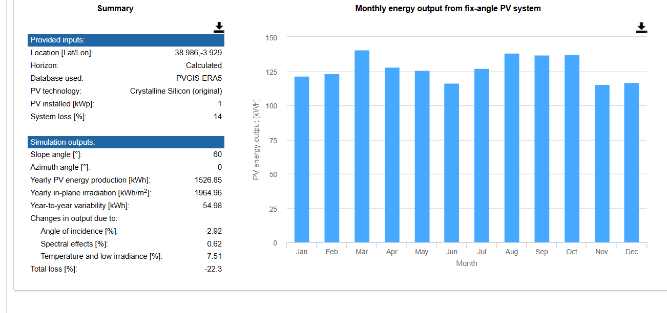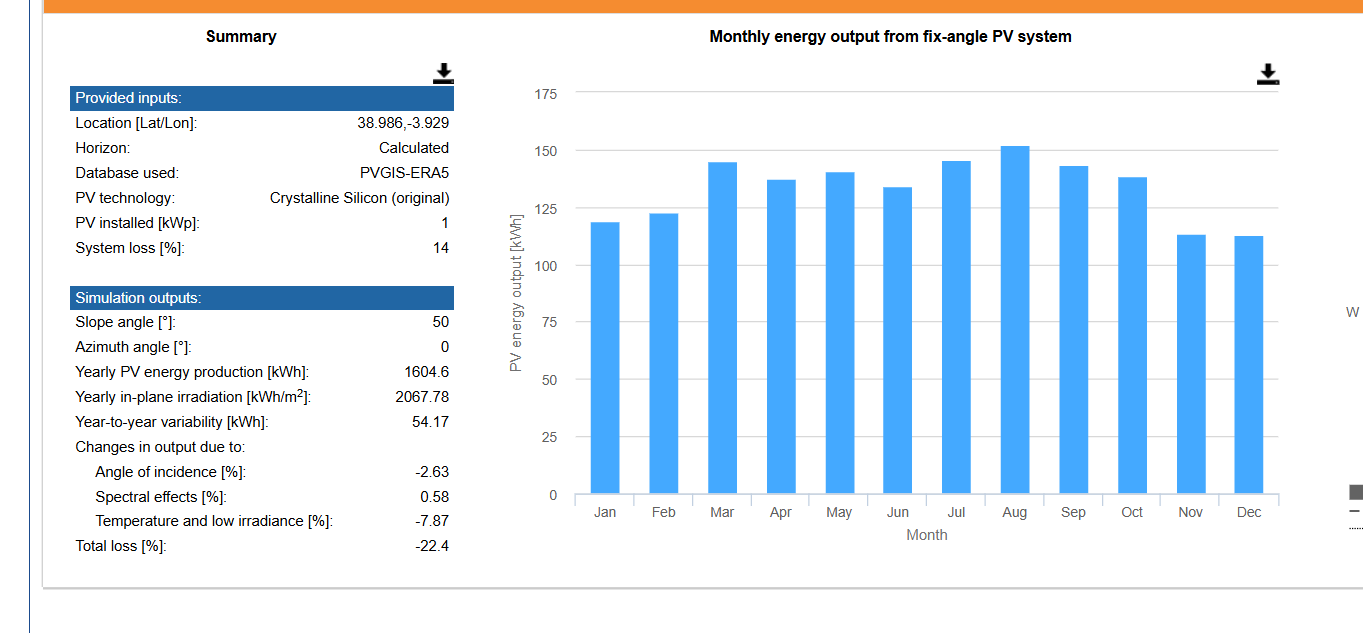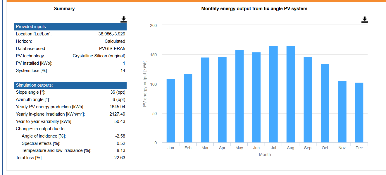 In fact, just playing now:- for optimised generation, with a random pin in Ciudad Real, it gives 1,646kWh/kWp and 165kWh July v's 102kWh Dec.