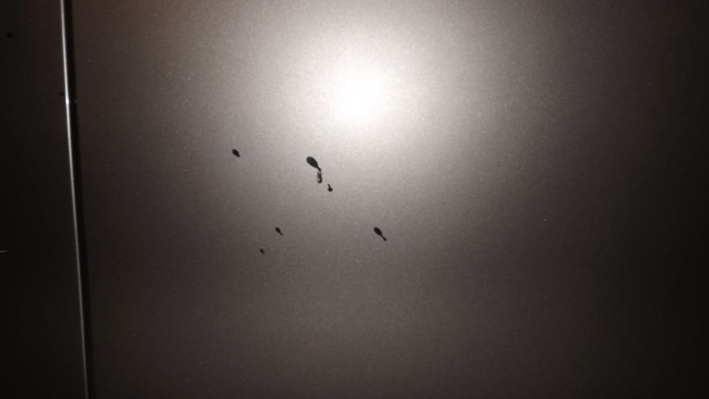 As mentioned it looks like something splashed onto it rather than something thats taken the paint away.
