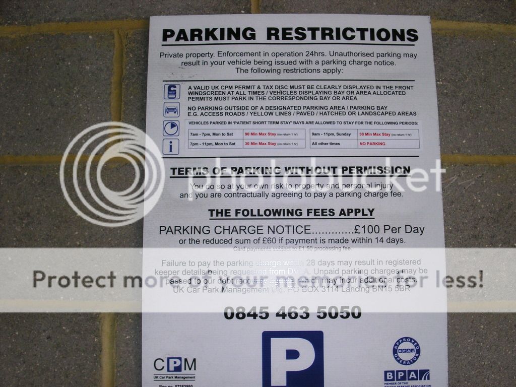 This is one of those absolutely hilarious signs that defines 'Terms of parking without permission' & then tries to claim damages. You cannot enter into a contract to do something that is forbidden. Not only that but they will charge £100 for not displaying a valid tax disk which must be a real moneyspinner nowadays.Grandad123 wrote: »Hi Izzy. Hopefully this is the sign.