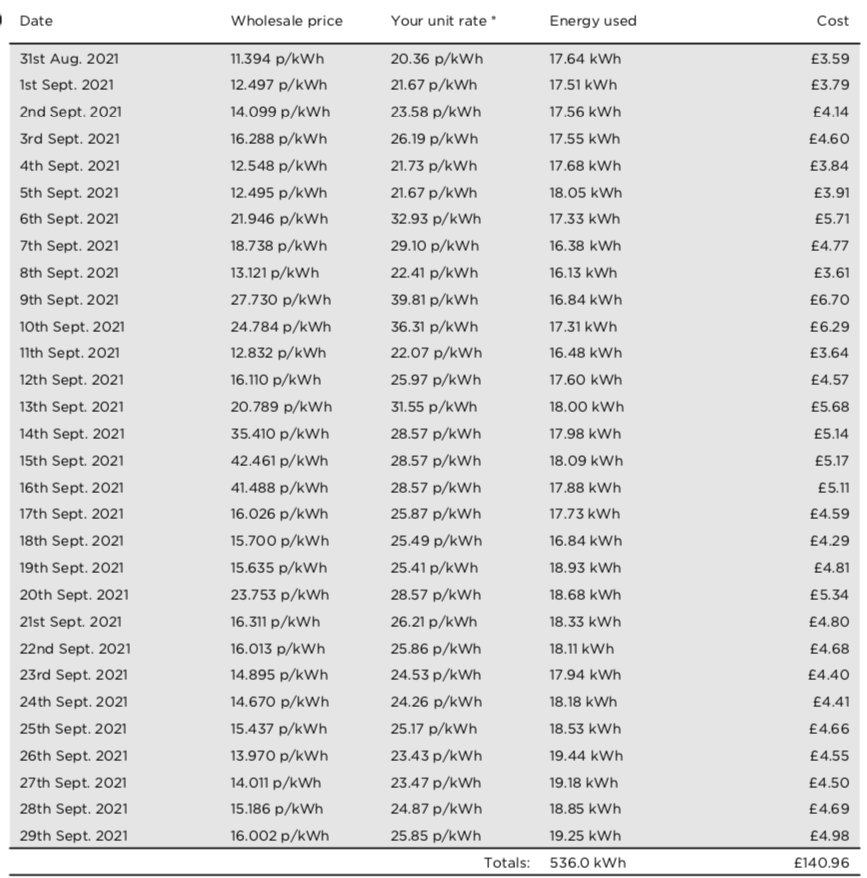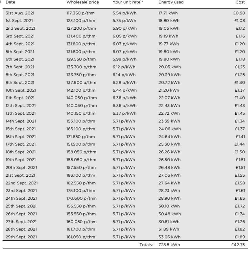 Well it seems that the Tracker is actually the best deal for us - it's a cheaper projection than the two deals the site is offering us. Given they are capping Tracker at 30p for eIectricity I am quite pleased with this month spend on electricity as it should remain about this as the only thing that will now kick in is gas central heating unless we start using electric heaters in some rooms. You can see the wholesale price has been fluctuating wildly.