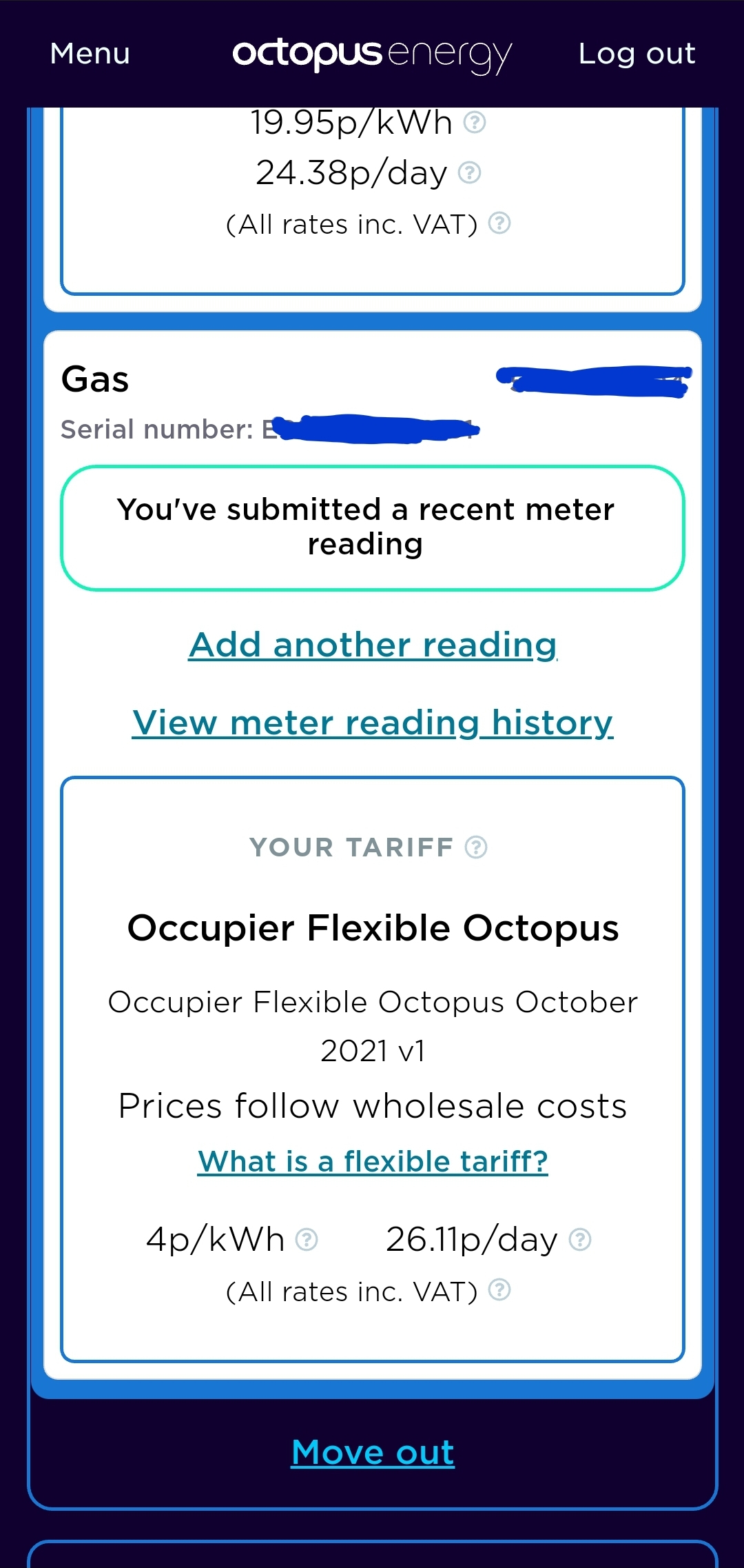 Spies said:Quick question, those with smart gas meters, how does it show under your account page, mine still looks like a traditional meter where you can manually submit a reading?That would suggest that Octopus have not yet taken control of the smart meter by uploading their security certificates.That can take a little while at times, but if it doesn't change in a week I'd suggest you email smart@octopus.energy.