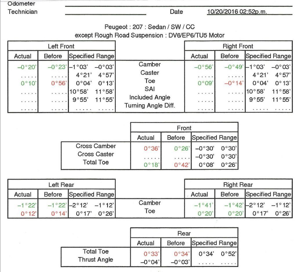 Do you know for a fact the rear toe cannot be adjusted? Yes, they really "should" all be green, otherwise what's the point in measuring it? I had my Octavia done and the only thing that can't be adjusted was the Castor.0