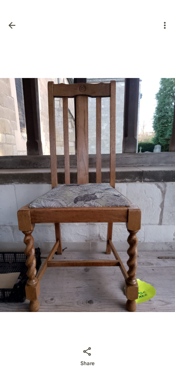3. The excellent donated barley twist chair has found a free home with a chap in difficulty, learning re-upholstery.