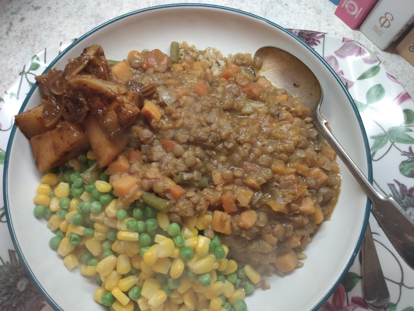 So for dinner tonight I had more of yesterday's vegetable stew, a portion of freekeh, petits pois and sweetcorn from the freezer and a dollop of spicy turnip. You can just see the freekeh at 12 o'clock in this photo, it looks rather like brown rice grains. (Apologies for the steam clouding my phone lens.)