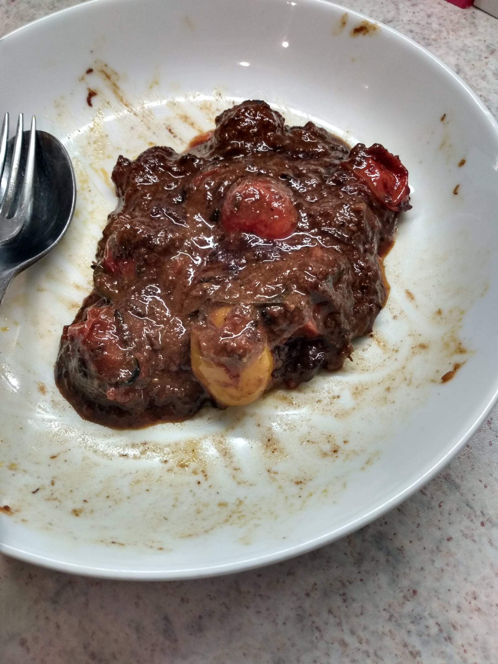 Sorry about the dirty dish, this was my second helping and the background traces of my first one don't really enhance anything do they. Anyway, the panch phoran mixture that she gives the ingredients for is well worth making, the smell when I heated it in the oil was wonderful. My only other note is that 1 1/2 teaspoons of salt tastes like a bit too much to my palate so it's worth starting with just a 1/2 tsp and tasting first before adding any more.