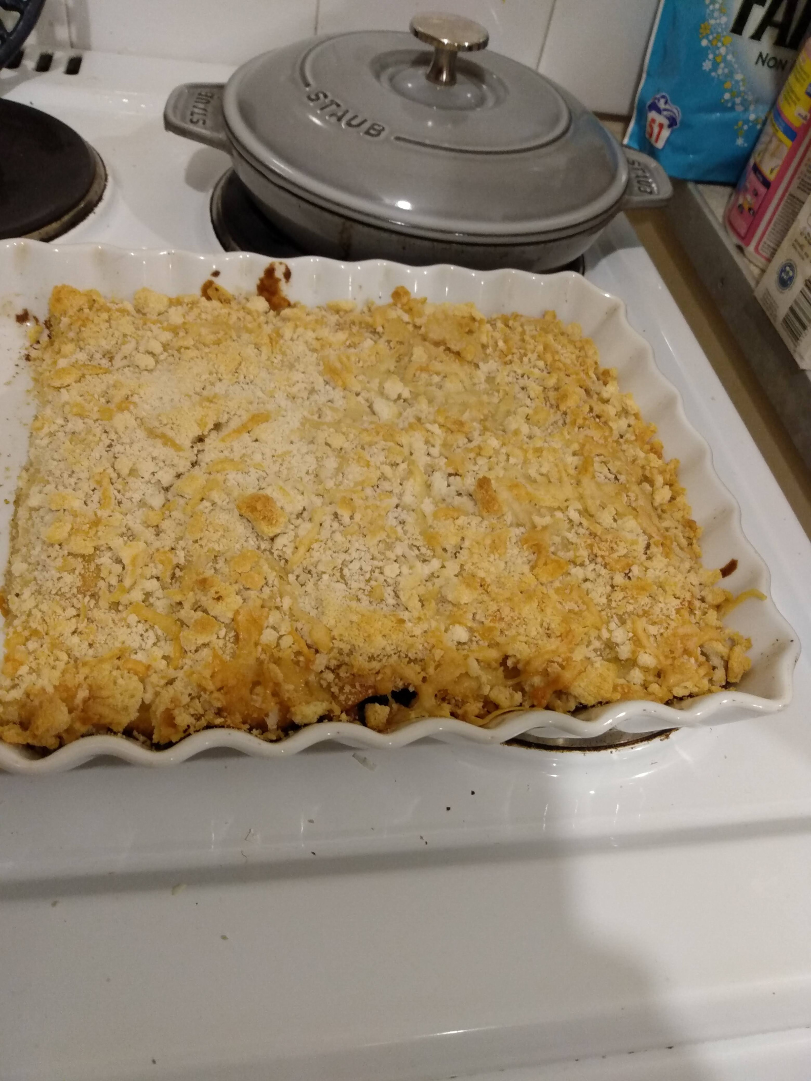 Meanwhile, I made Nigella's Crepes tonight and then filled 7 of them with thawed spinach and petits pois from the freezer and a few pine nuts, popped them in a dish and then covered them with a bechamel to use up the last of my blue cheese and whizzed up a bit of stale bread from the freezer to go on top.
