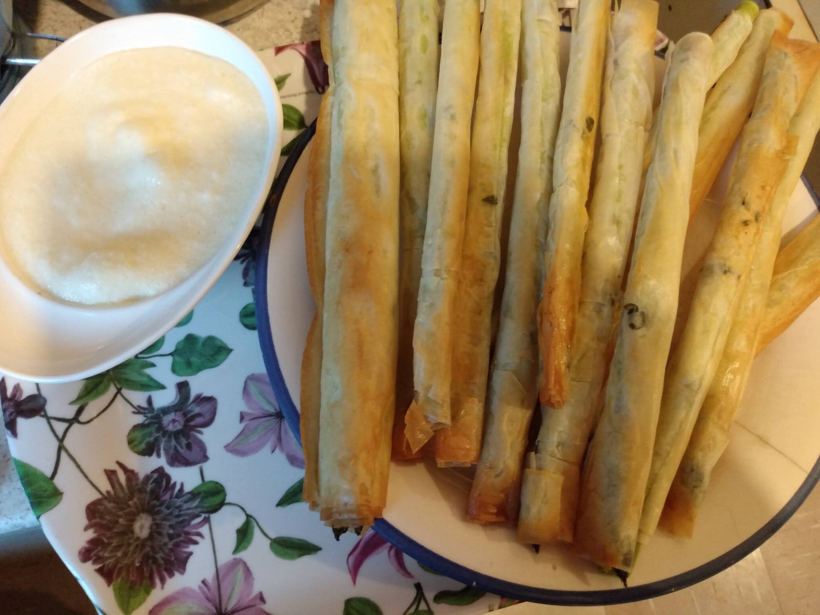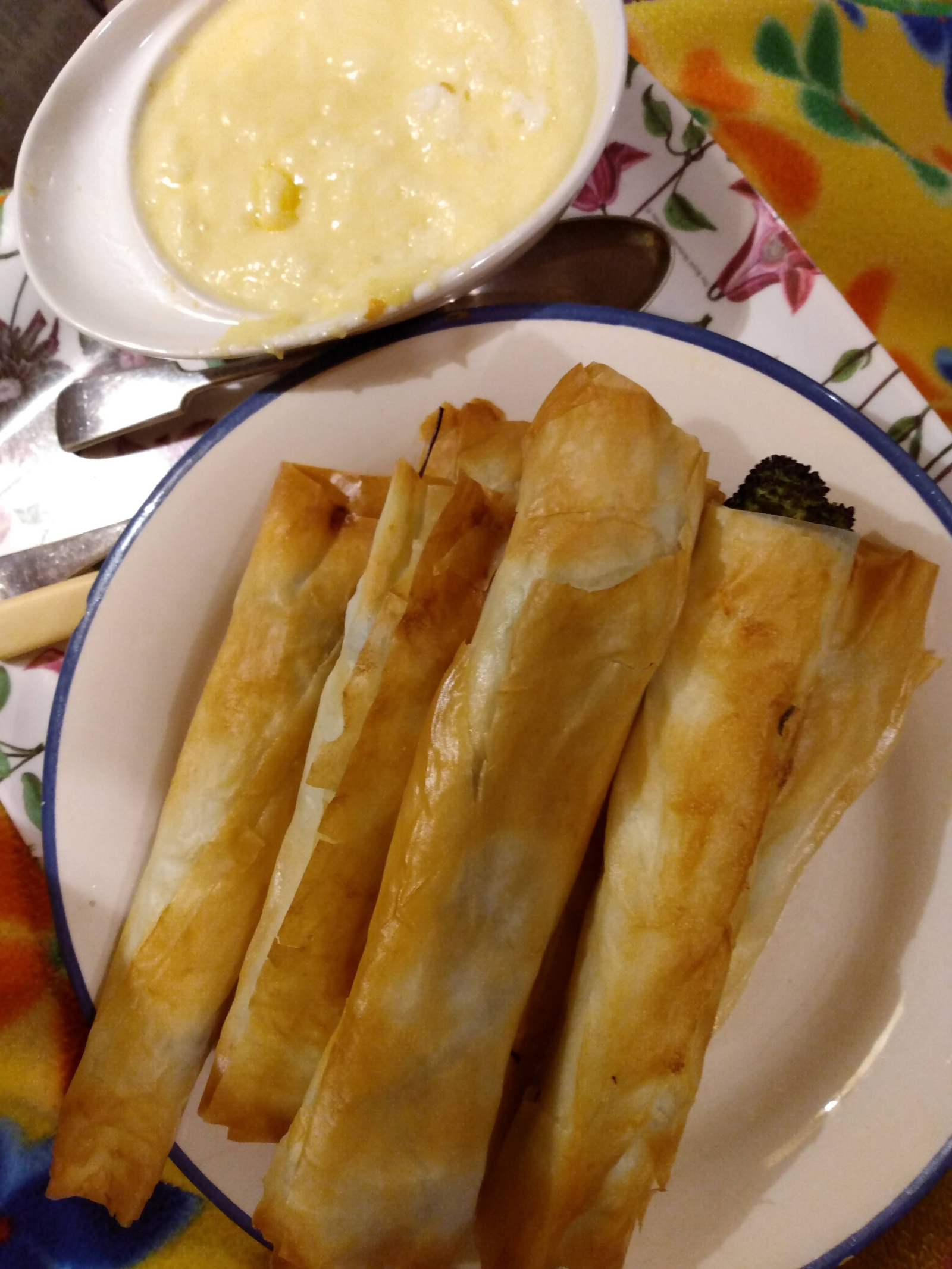I received asparagus and purple sprouting broccoli in my veg box on Friday so this evening I used up the rest of a packet of filo and a grana padano rind to make a variation on this Nigel Slater recipe and I also made Delia Smith's Foaming Hollandaise to eat with them.