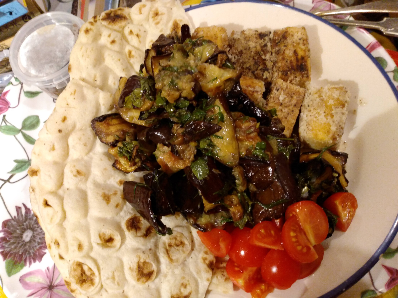 Anyway I made an aubergine, garlic and herb dish this evening and ate it with a huge flatbread, tomatoes and more crispy tofu with the leftover dipping sauce from the other day. For pudding I had a pear with some cheese and walnuts and a decaf coffee.