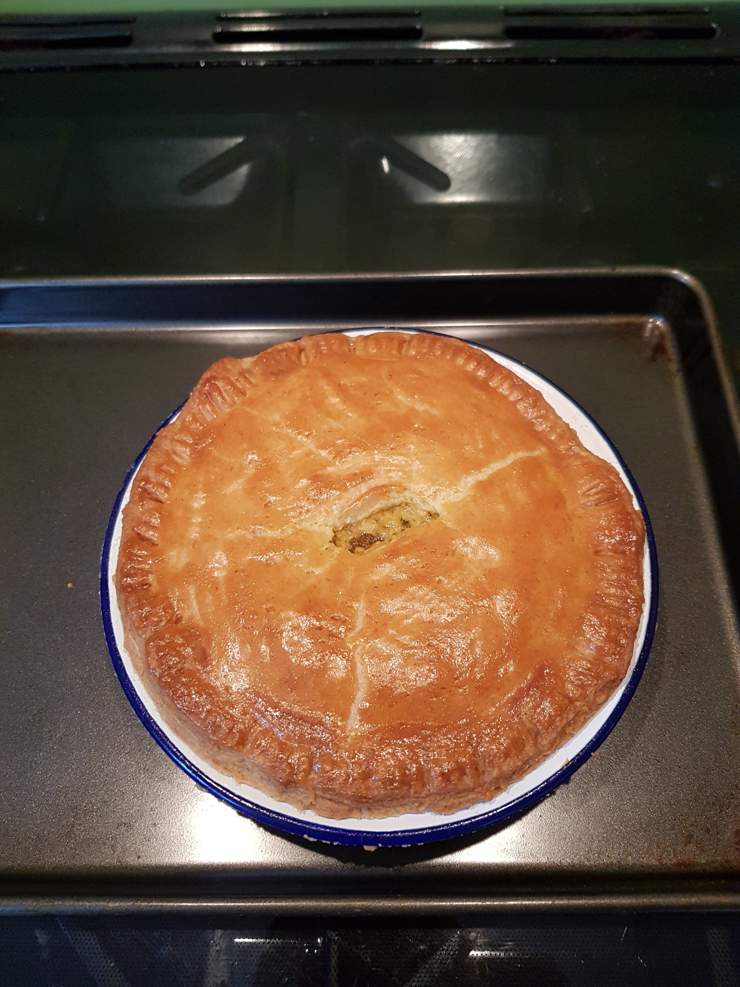 In honour of National Pie Week, I threw together a fridge pie: milk pastry containing layered precooked onions, leeks & mushrooms and grated cheese. To make it a proper pie night, it was served with mash and mushy peas.