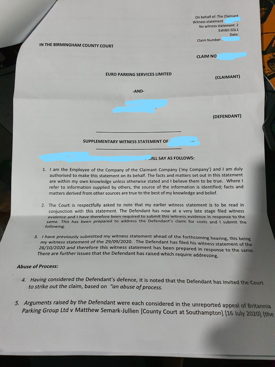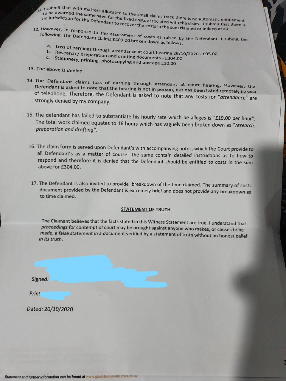 my WS was signed 10th Oct and sent through email the next day to all parties. I have mentioned/countered the case in step 15 of my WSCoupon-mad said:Just object to it at the start and point out that your WS was in fact filed & served on xx/10/2020 and not 26th (date of the hearing). And point out that this supplementary WS and the previous one (maybe?) has an altered statement of truth trying to absolve the 'witness' from their personal honest belief by instead saying 'the Claimant' believes, rather than the signatory 'witness'.