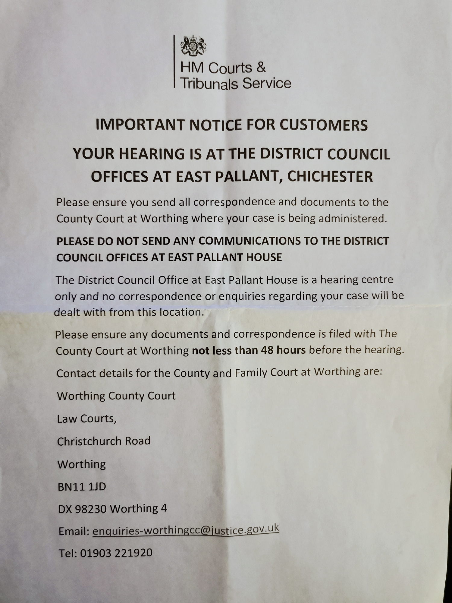 OK I take it back, leave the top left as 'Worthing' as there is no county court at Chichester as such.PRIVATE 'PCN'? DON'T PAY BUT DON'T IGNORE IT (except N.Ireland).