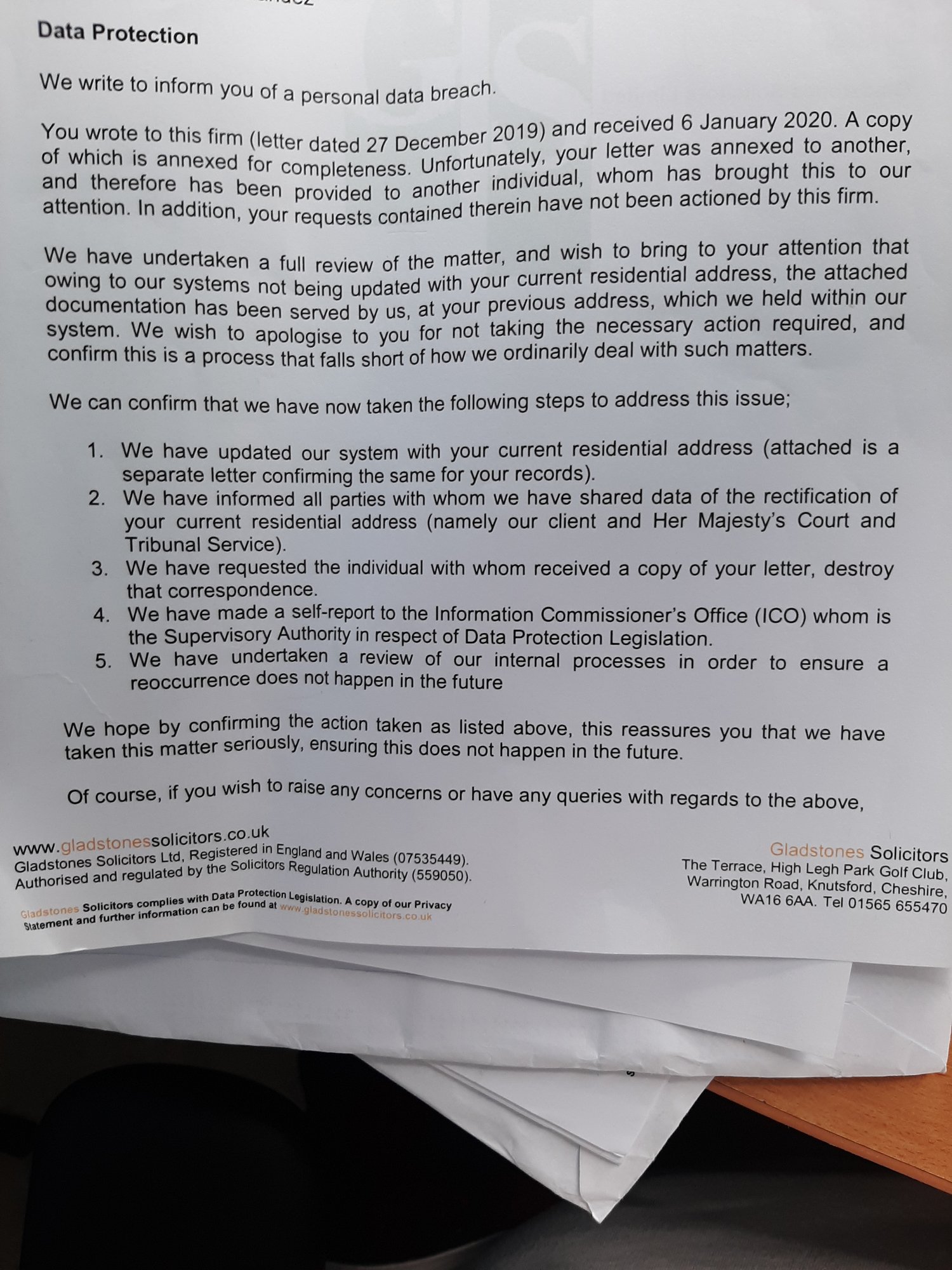 I have just received (to my current address) a letter from Gladstones titled "Without Prejudice Save as to Costs" and informing me of a personal data breach. I have attached photos. They have admitted that they added my change of address request to another file. They have included all the correspondence that was sent to the wrong address, including what they call the Claimant's WS. Apart from raising a complaint to the ICO I'm not sure whether I can leverage anything from this admitted breach. Perhaps request a stay on any future hearing date?