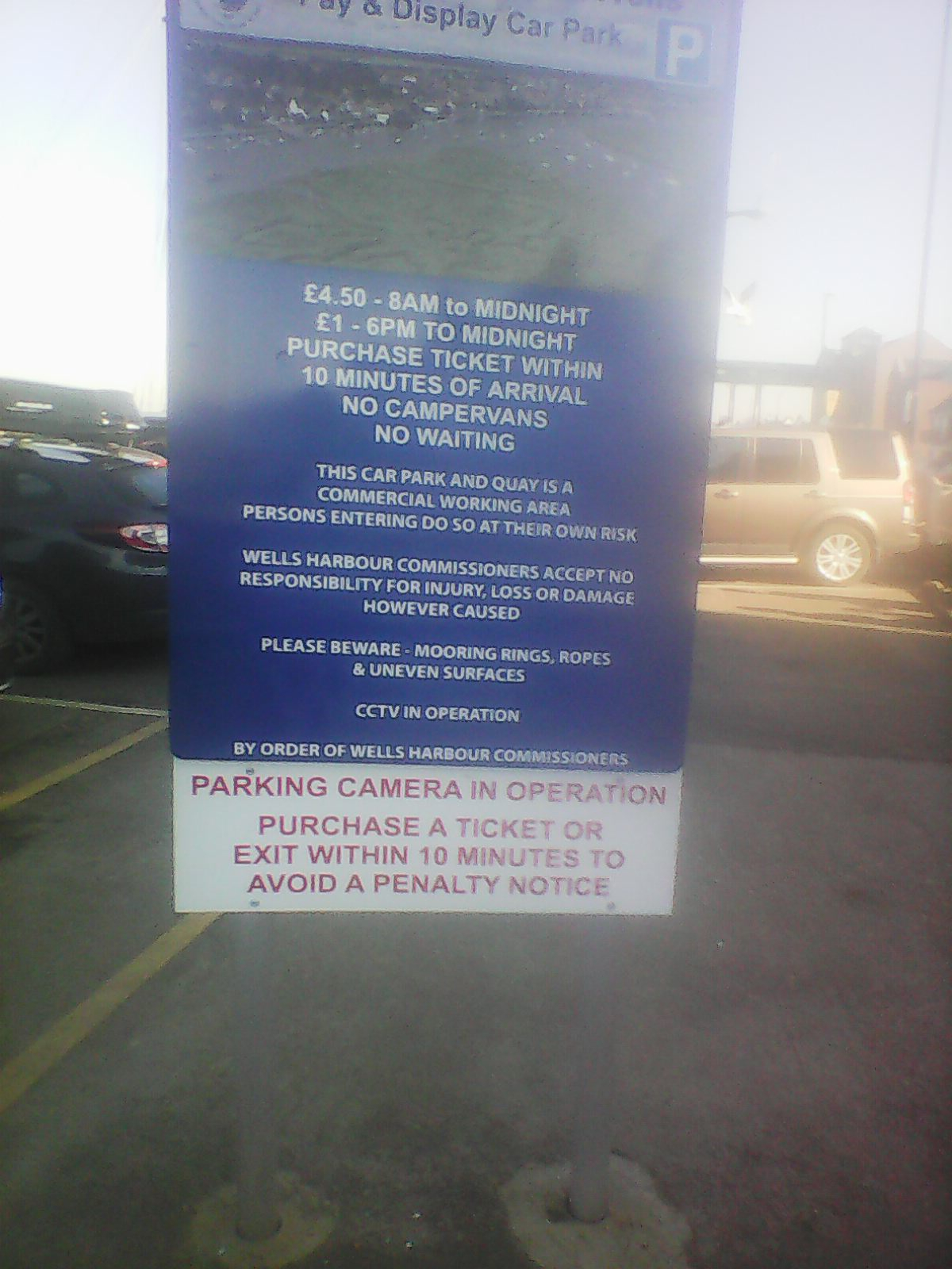 I was referring to the signs facing the road. I've attached some images from December 2018 and February 2019. The first shows the entrance sign on the left-hand side, which complies with Appendix B of the BPA CoP, and the second image shows the sign on the right-hand side, which doesn't comply with the CoP. The driver can't see the compliant sign when approaching from the east. The last image shows a sign that claims that you could face a 'Penalty' if you do not buy a ticket within 10 minutes. As the Harbour Master claims that there are no byelwas in place to control parking, then they must be mis-representing their authority as per the BPA CoP ;