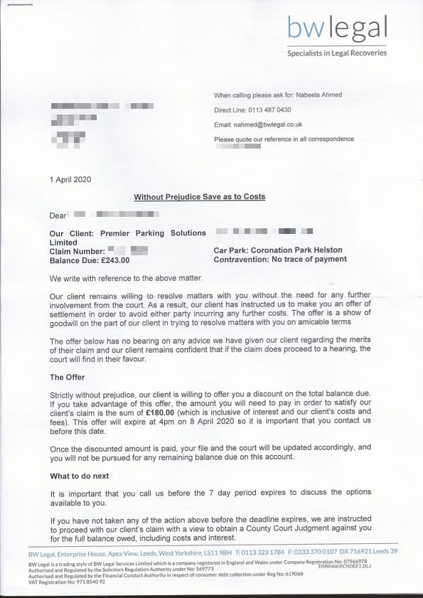In this case, I can see you are concerned that BW Legal adopted an approach which you consider to be intimidatory whilst they were acting for Premier Parking Solutions Limited. You are also concerned that they provided you with misleading information by advising there was a notice of pending county court judgement and by indicating they would enter a judgement against you. I have noted their letter dated 7 October 2019 addressed to Mrs XXXXX also states a county court judgement may be entered against you and it refers to if a CCJ is granted. As you rightly indicate, it is for a court to determine the outcome of the matter.