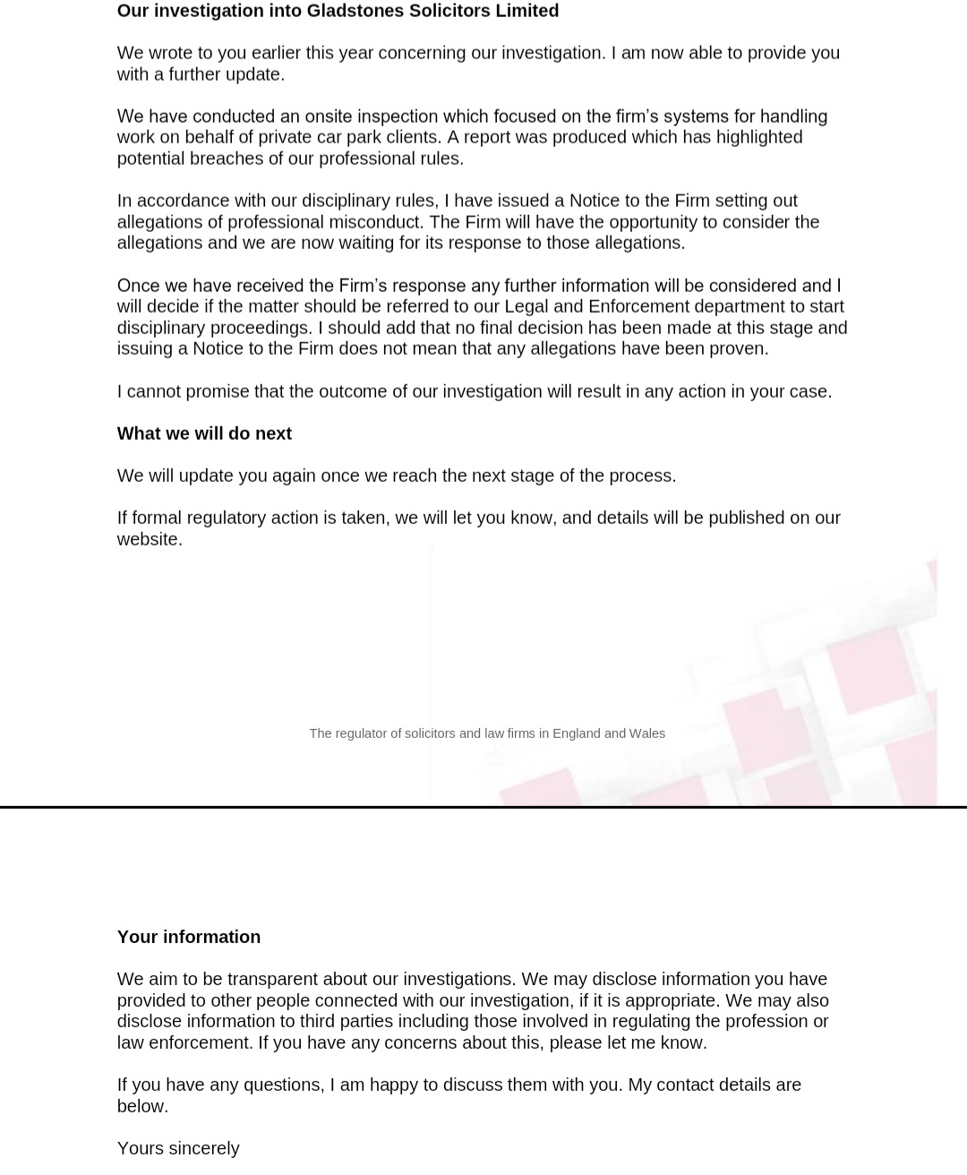 I received an email too. I didn’t say because mine said confidential pending the outcome - plus I wanted to share really good news if the SRA does take action (which it may not). I do have an alert on all the Gladstones’ companies and most have moved from the address High Legh Golf Club which I said was not secure enough to store hard copies of personal data.