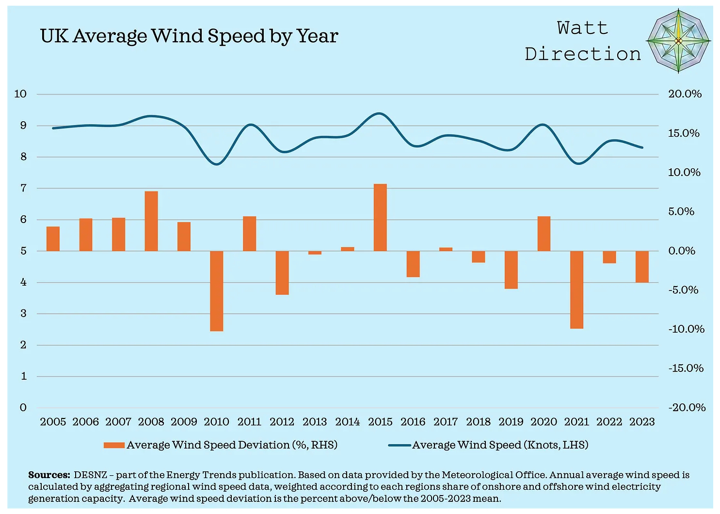 Installed wind farm capacity increased from 30GW in 2023 to 32 GW in 2024 so we might have expected an increase in output. However, as you say, wind speeds were lower. Since around 2015 there appears to have been a downward trend in wind speeds.