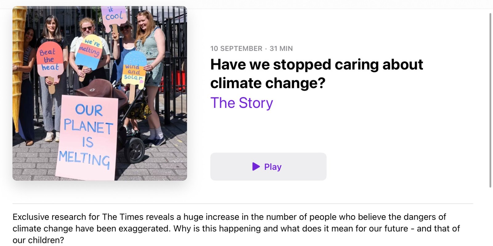 JKenH said:Interesting podcast about changing attitudes to climate change in the UK and the impact on UK politics.“From this…I believe that we have a moral duty. We will be ending our contribution to climate change by 2050 and legislating for a net zero emissions target.Green is good. Green is right.To this…Net zero by 2050 is impossible. I want a better future and a better environment for our children, but we have to get real.https://podcasts.apple.com/gb/podcast/have-we-stopped-caring-about-climate-change/id1501716010?i=1000725803493 includes transcript if, like me, you prefer the written to the spoken word.