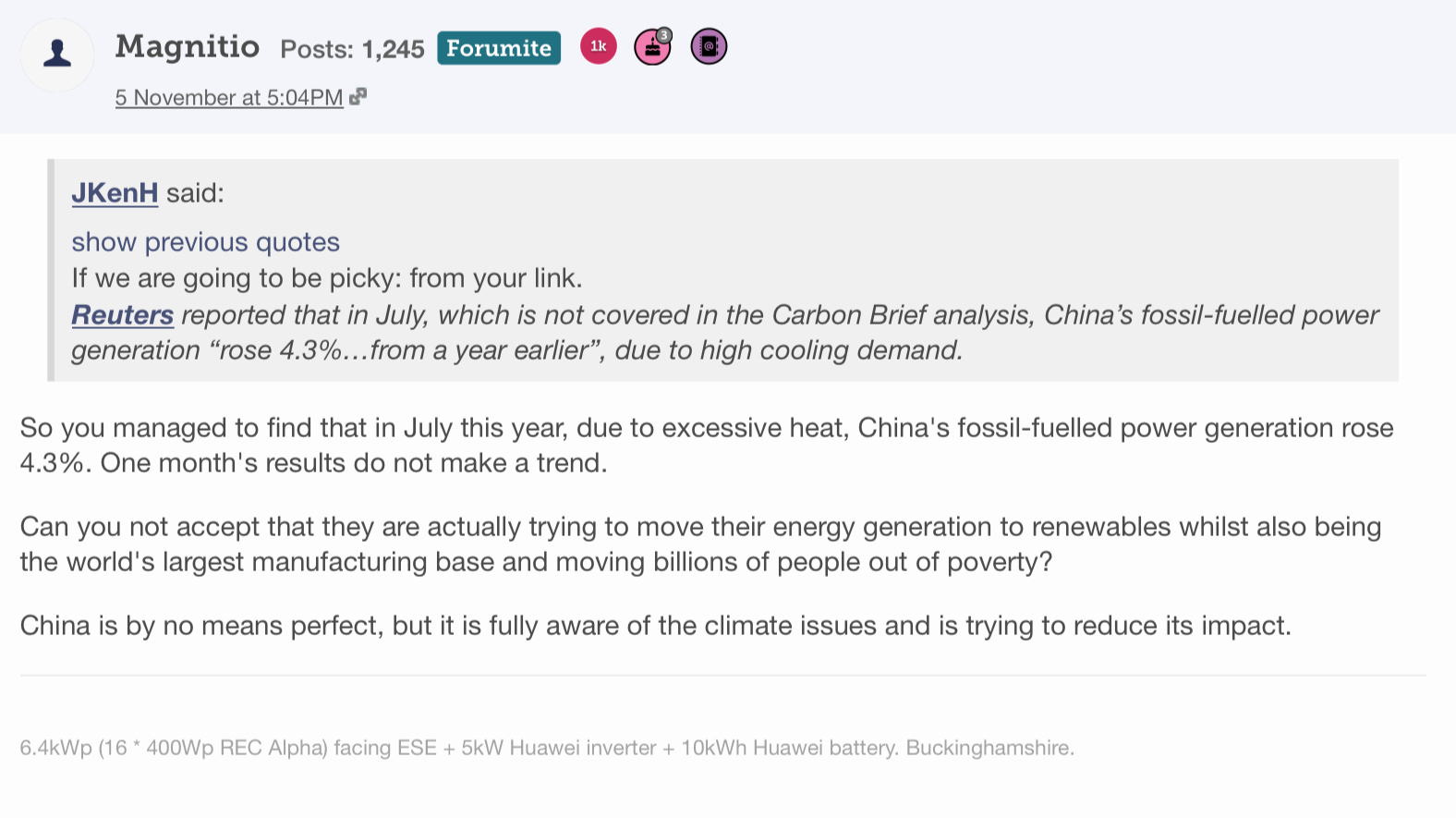 @Screwdriva’s “Overexposed: a study on forced labour in Solar Panel Manufacturing (by Brand)” thread was getting dragged off topic by an argument about China’s fossil fuel use and the last post there was: