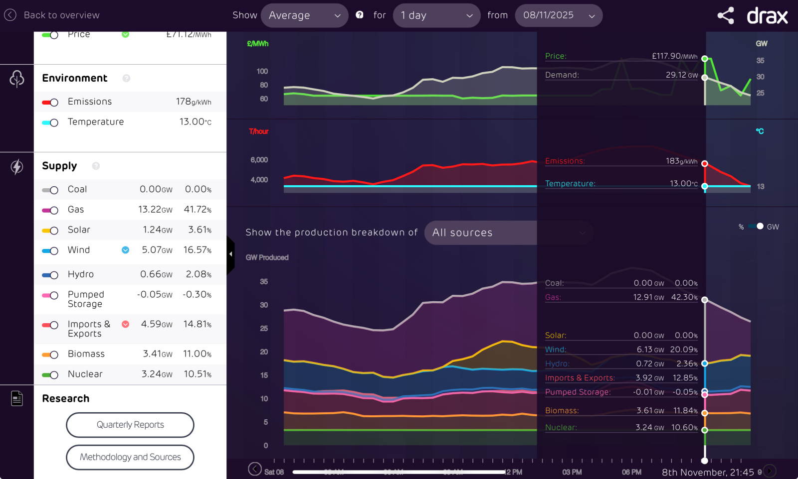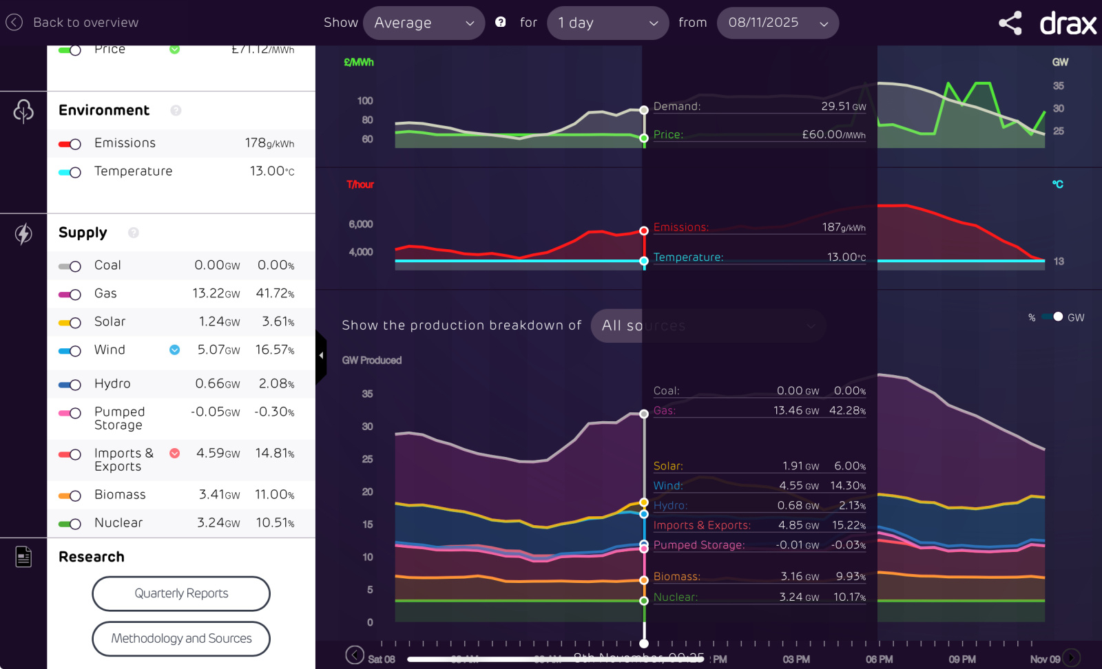 While therefore you may imagine in an ideal world batteries are being filled up with renewable energy, they are in fact getting the same grid mix as where they are located. Rather therefore than consider the ideal scenario of a battery charged with zero-carbon energy that you fed to Google we need to look at the real world.Let us have a look at a day like yesterday which was fairly typical for November - some sun, some wind but over the day as a whole not enough renewables to meet 20% of demand. As an operator of a BESS one would ideally want to charge when prices were low and discharge when prices were high to achieve maximum profit.I am attaching two screenshots from Drax Electric Insights, one when prices were lowest and another when highest.