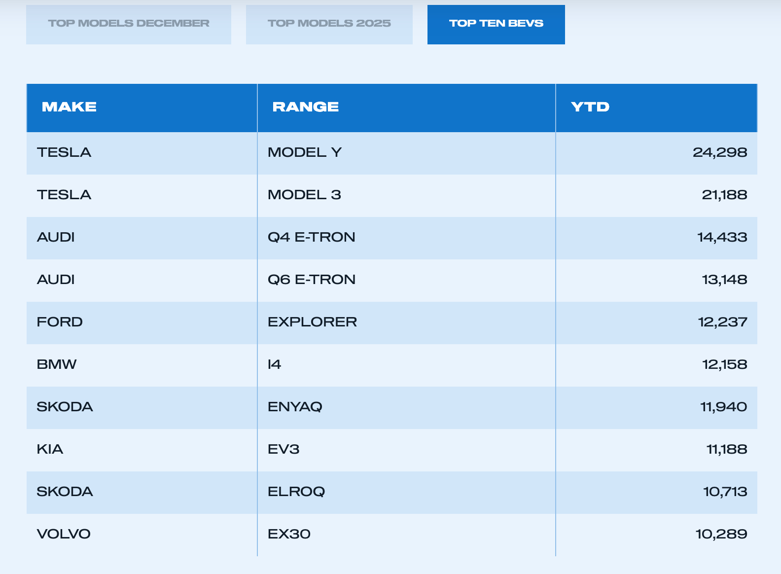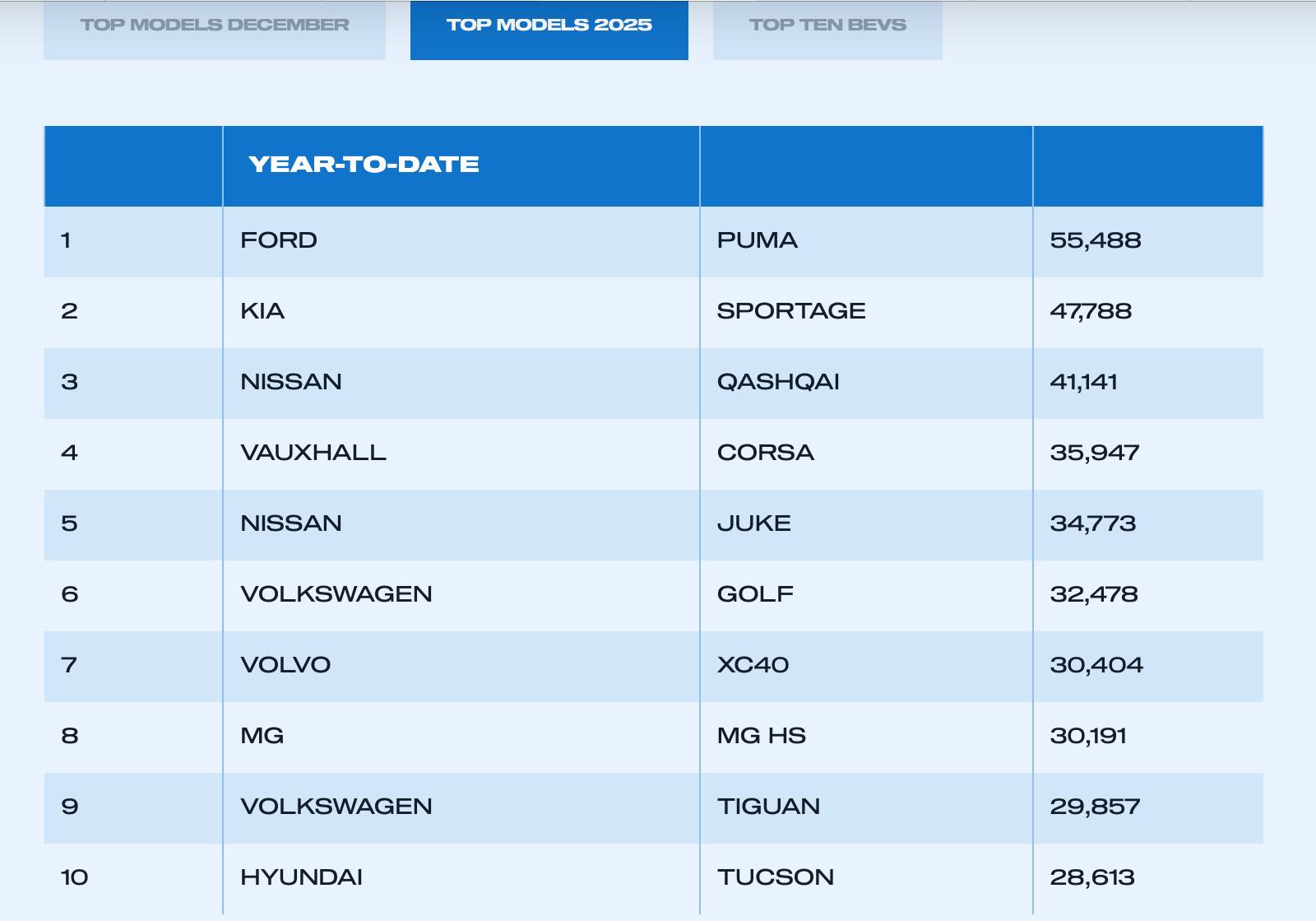 I find it interesting that no EVs make it in to the top 10 best selling cars. Surprisingly, to me, Ford’s best selling EV is the Explorer (which I wasn’t even aware existed). I would have expected it to be the electric Puma. Tesla, despite their woes, still field the top two selling EVs and Audi the next two.