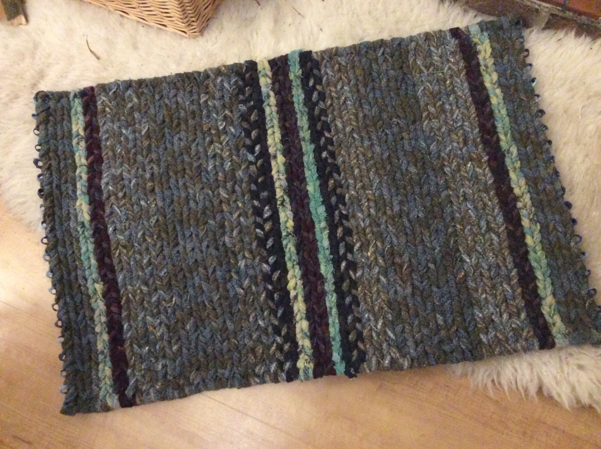 Quite chuffed with this bit of MDM&M: a rug made from moth-eaten old wool blankets & rugs, cut into strips & woven on a warp of dead duvet cover! The blankets were from the pile that my son's mini-dachshund slept on (and in) when he was a puppy; he can manage with just one or two now. So 3 blankets & one raggedy duvet cover have turned into a tough but soft rug, which will be great for fireside use as wool doesn't burn. (The warp loops visible at the edge will vanish into the weave over the next few days as the tension evens up.) Eyeing up the rest of the blankets now...