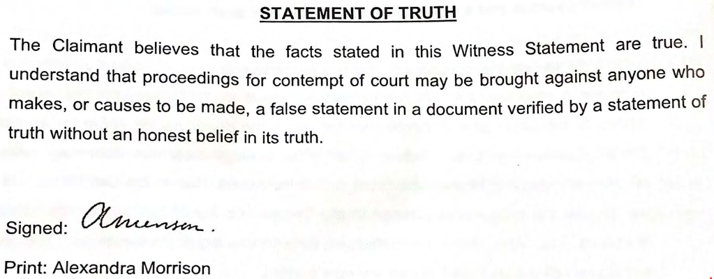 Why does Alexandra Morrison start her Statement of Truth with "The Claimant believes..."?