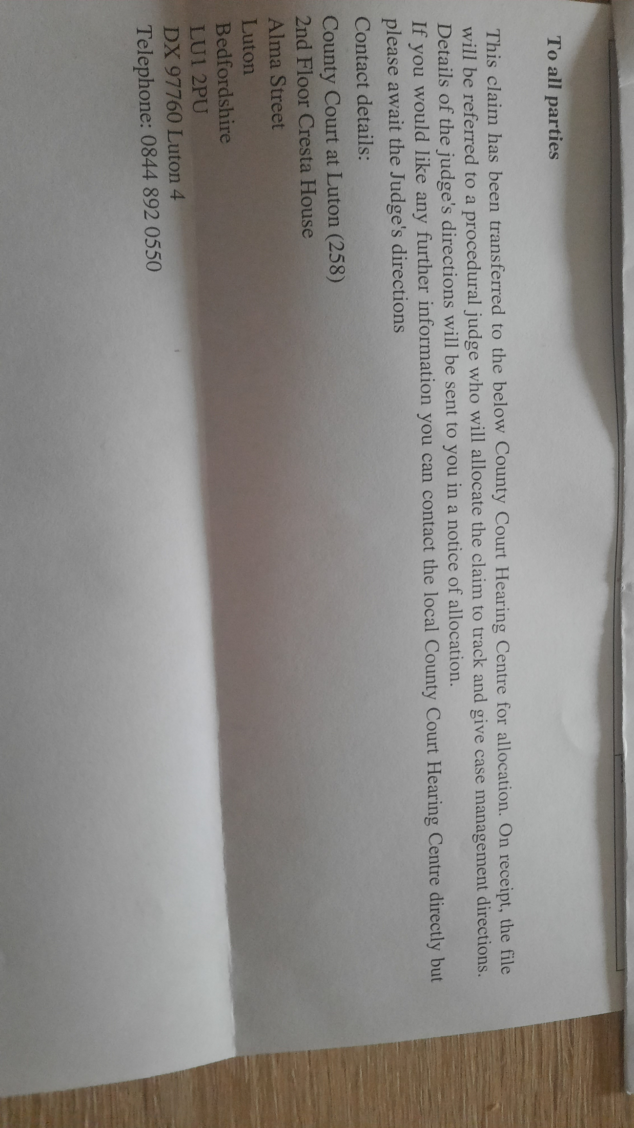 Here is the letter I got. It says Notice of Transfer of Proceedings. This is how it reads. At the top of has prenier park limited and myself also claim number and date.0 -