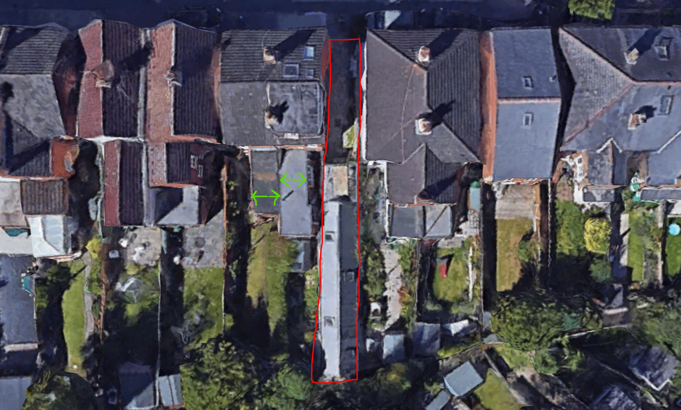 Interestingly, looking at aerial images, the workshop building + driveway (shown within the red outline) looks wider than the extensions of the neighbour next door and the neighbour next door to them.